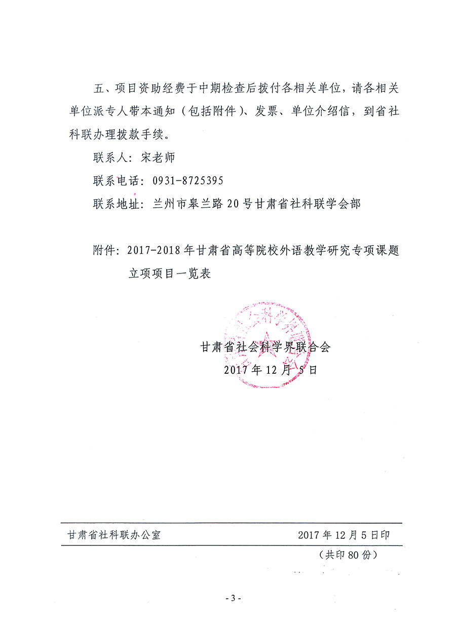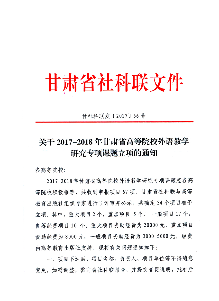 转发甘肃省社科联“关于2017-2018年甘肃省高等院校外语教学研究专项课题立项的通知”