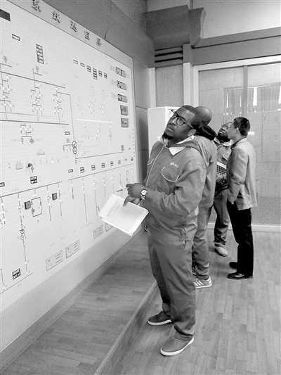 图为该校2012级赤道几内亚留学生在故县水利枢纽电站中控室进行运行实习。