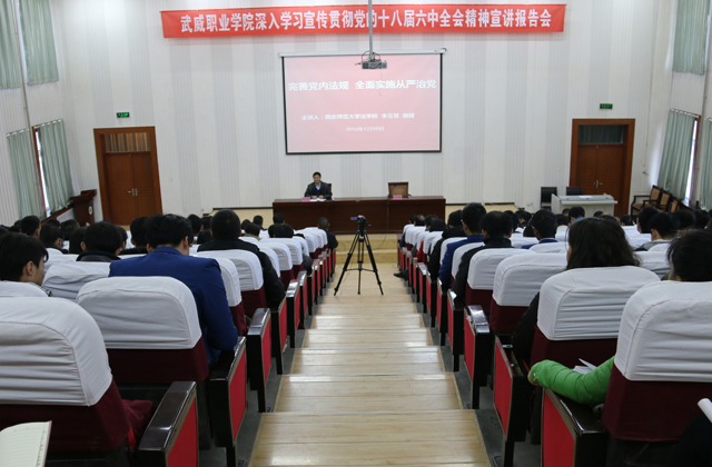 为全面准确学习宣传党的十八届六中全会精神,12月9日上午,学院在尚德楼正德厅举办“深入学习宣传贯彻党的十八届六中全会精神宣讲报告会”,邀请西北师范大学教授李玉璧作题为《完善党内法规 全面实施从严治党》的宣讲报告。学院副院长王永绪、潘玉华、田迎春,中层干部及师生代表200余人参加报告会。田迎春主持宣讲报告会。