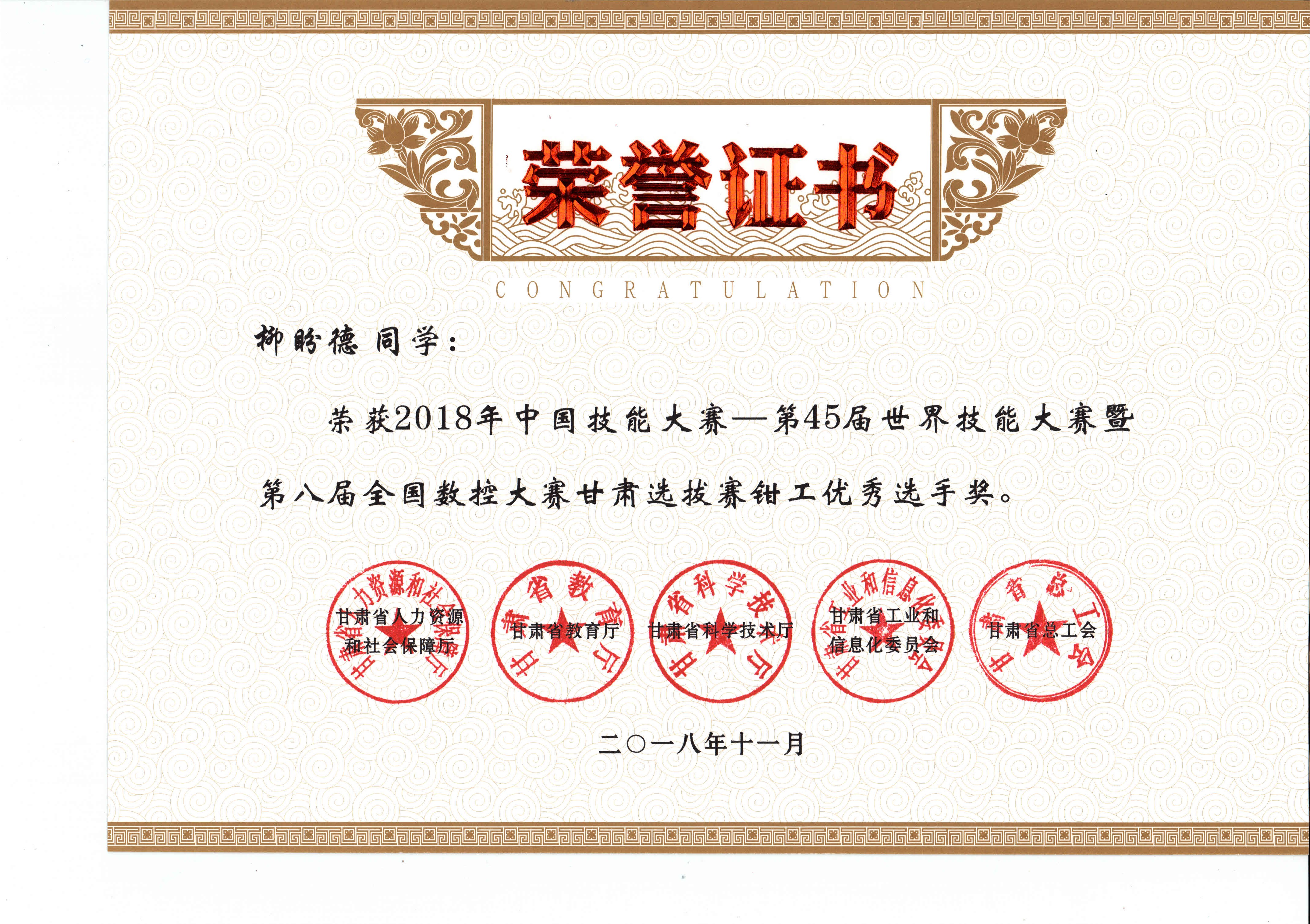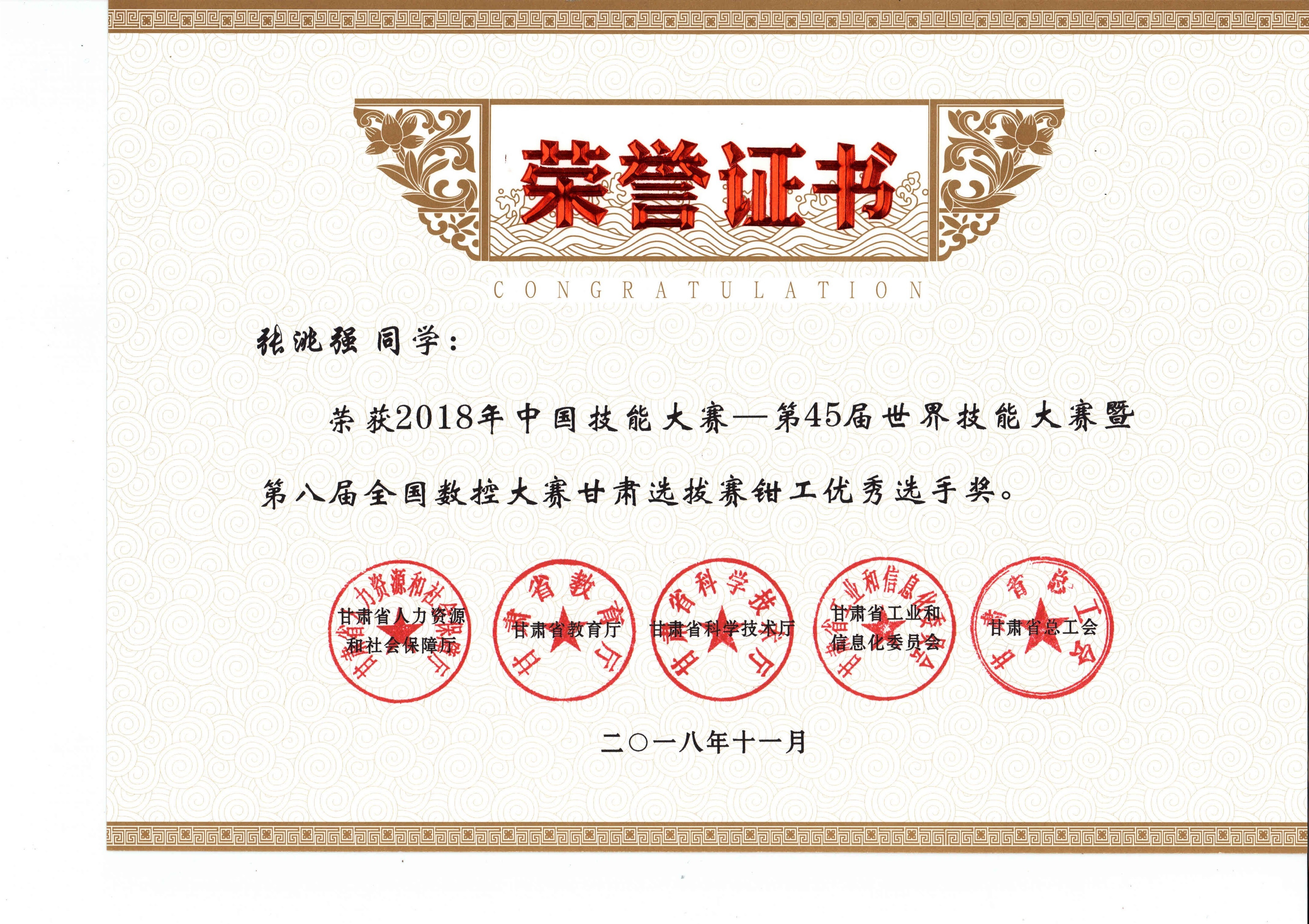2018年中国技能大赛--第45届世界技能大赛暨第八届全国数控大赛甘肃选拔赛(钳工项目)获奖证书