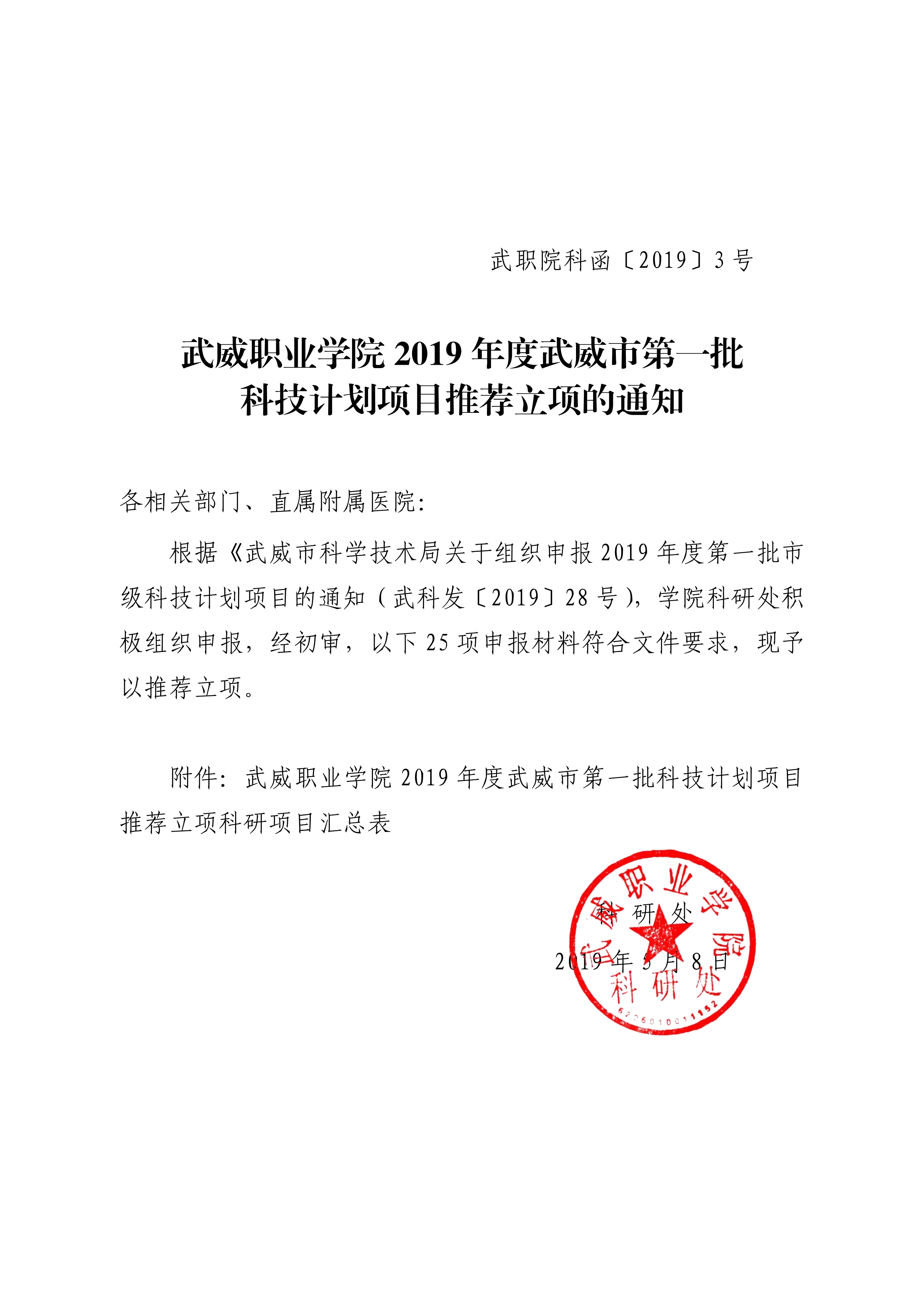 武威职业学院2019年度武威市第一批科技计划项目推荐立项的通知