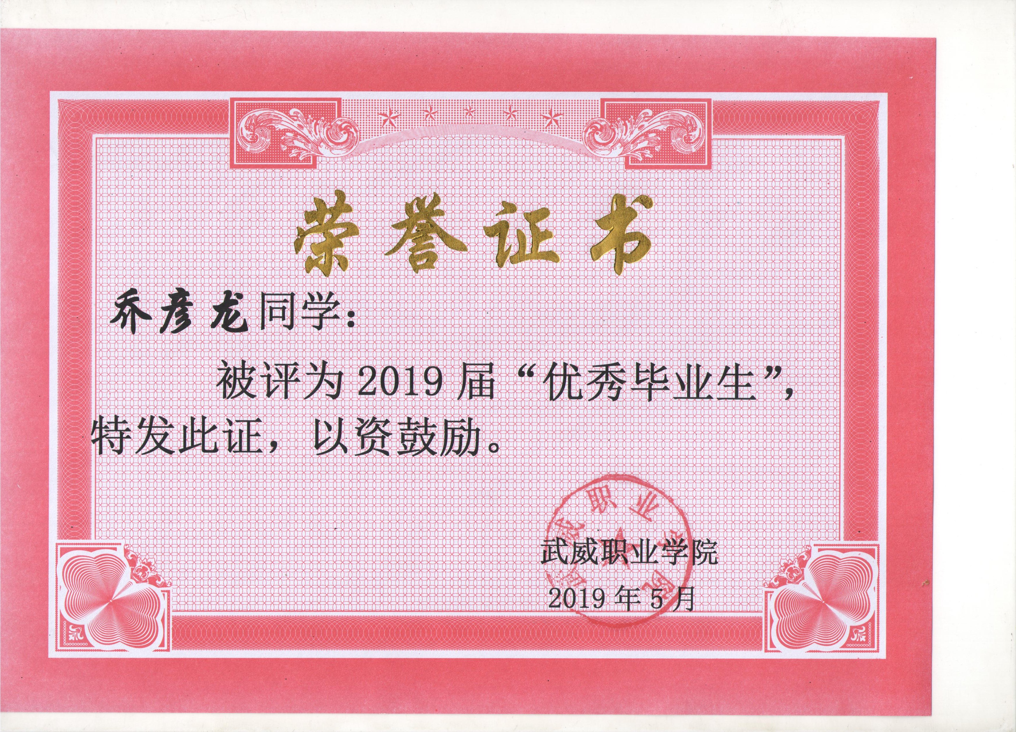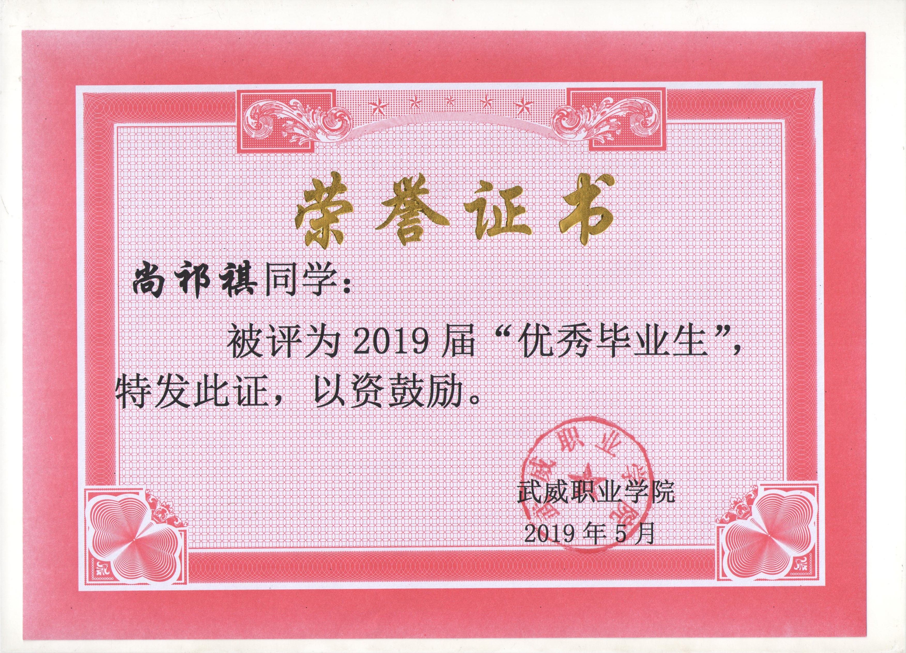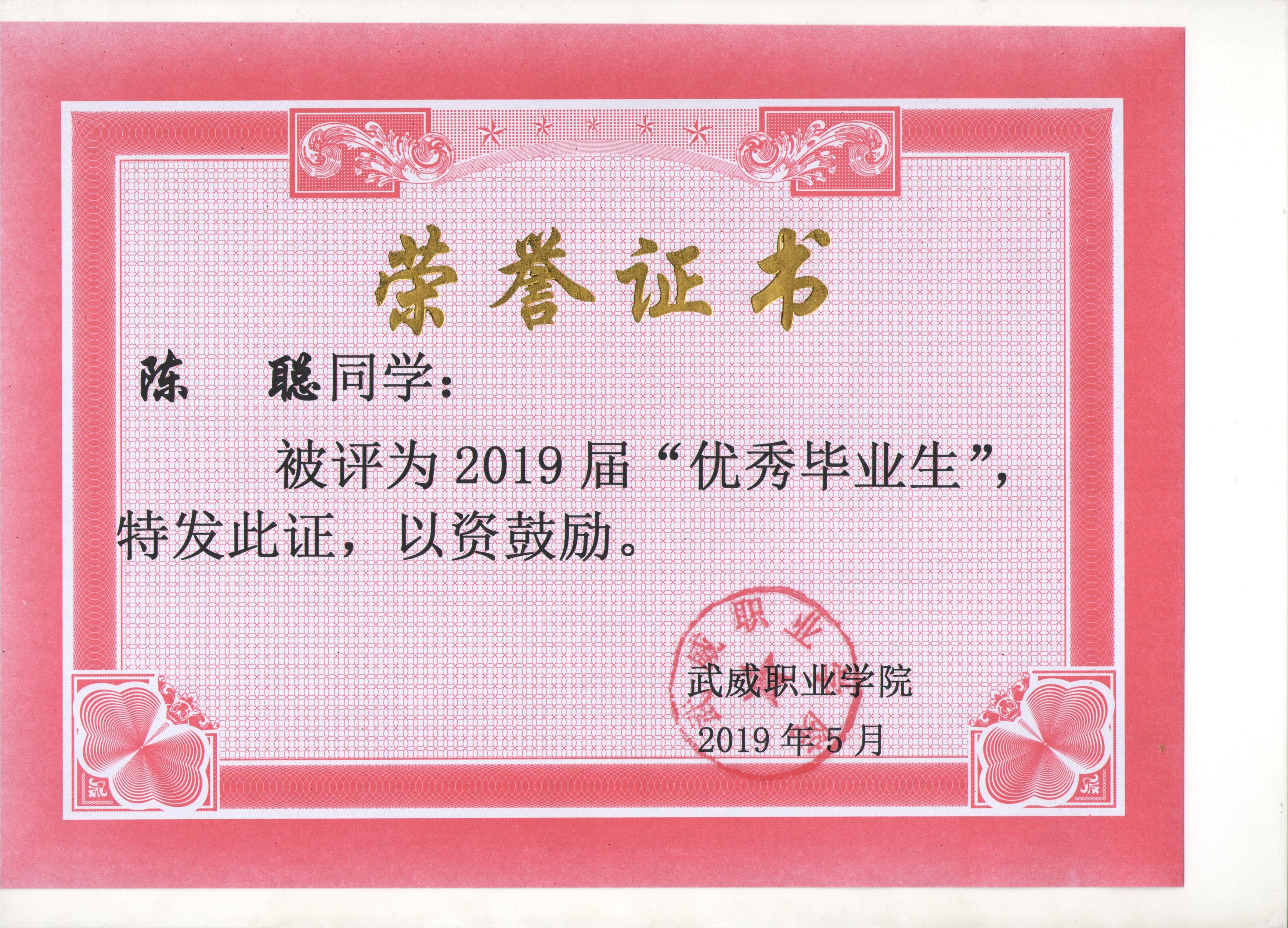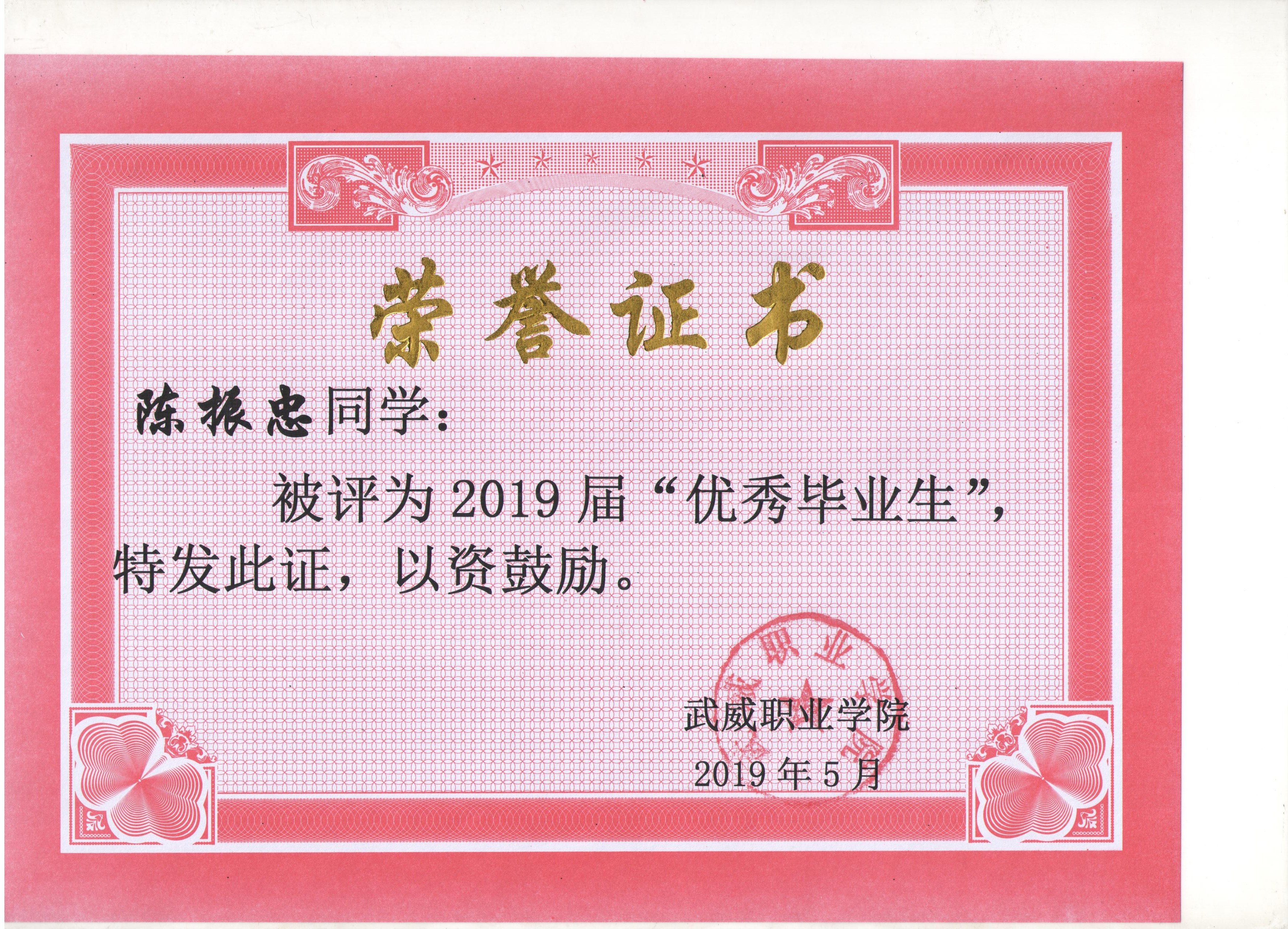 我系蔡少荣等19名同学荣获武威职业学院2019届“优秀毕业生”荣誉称号