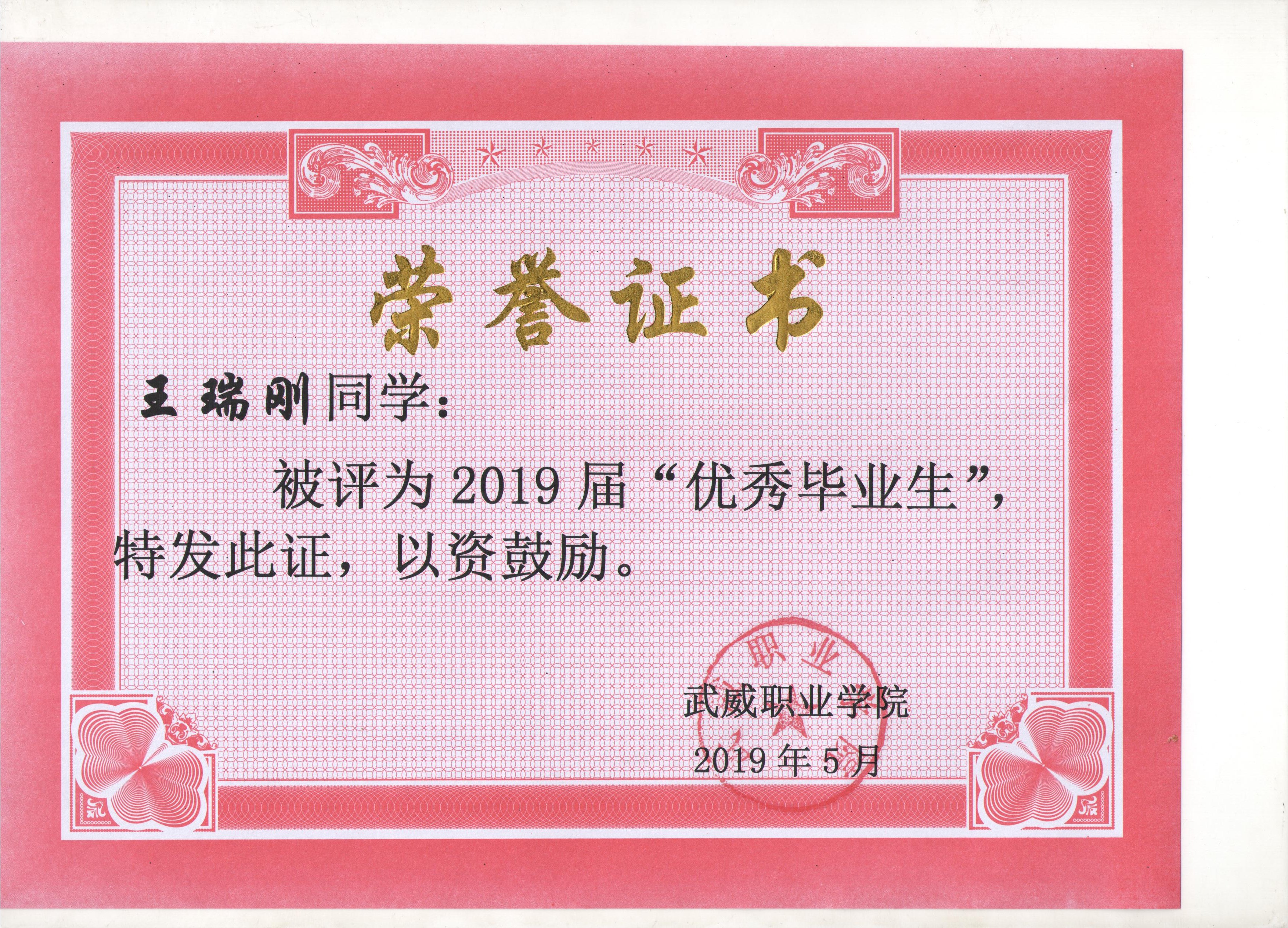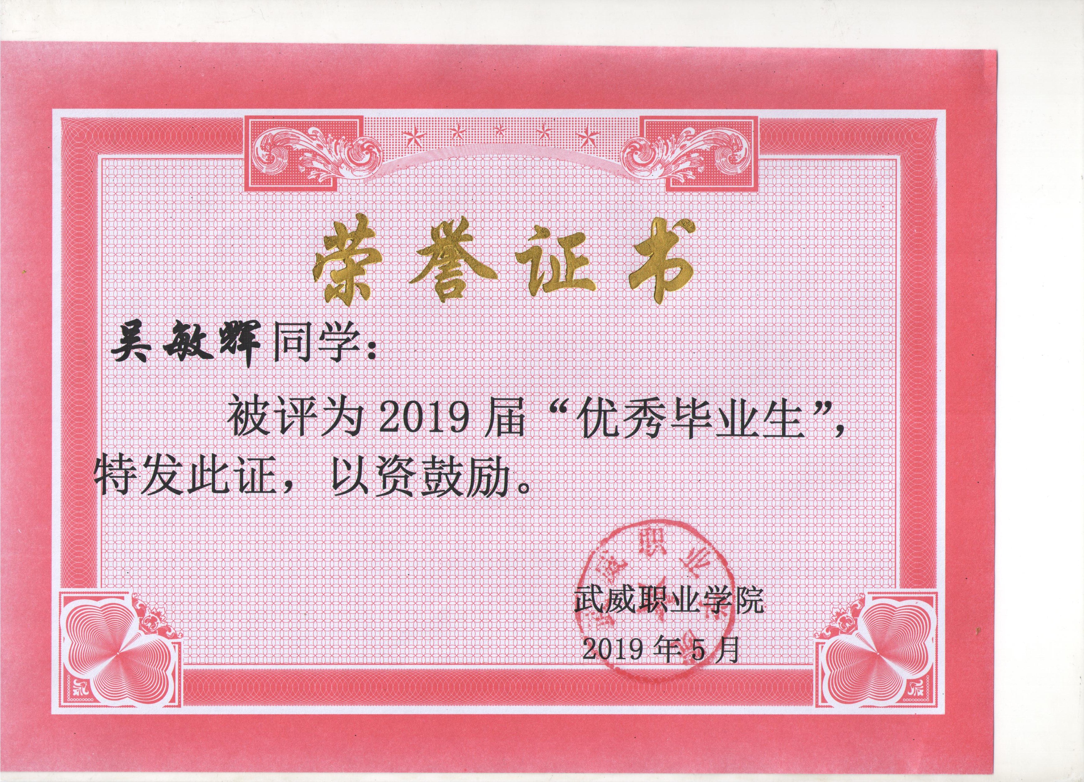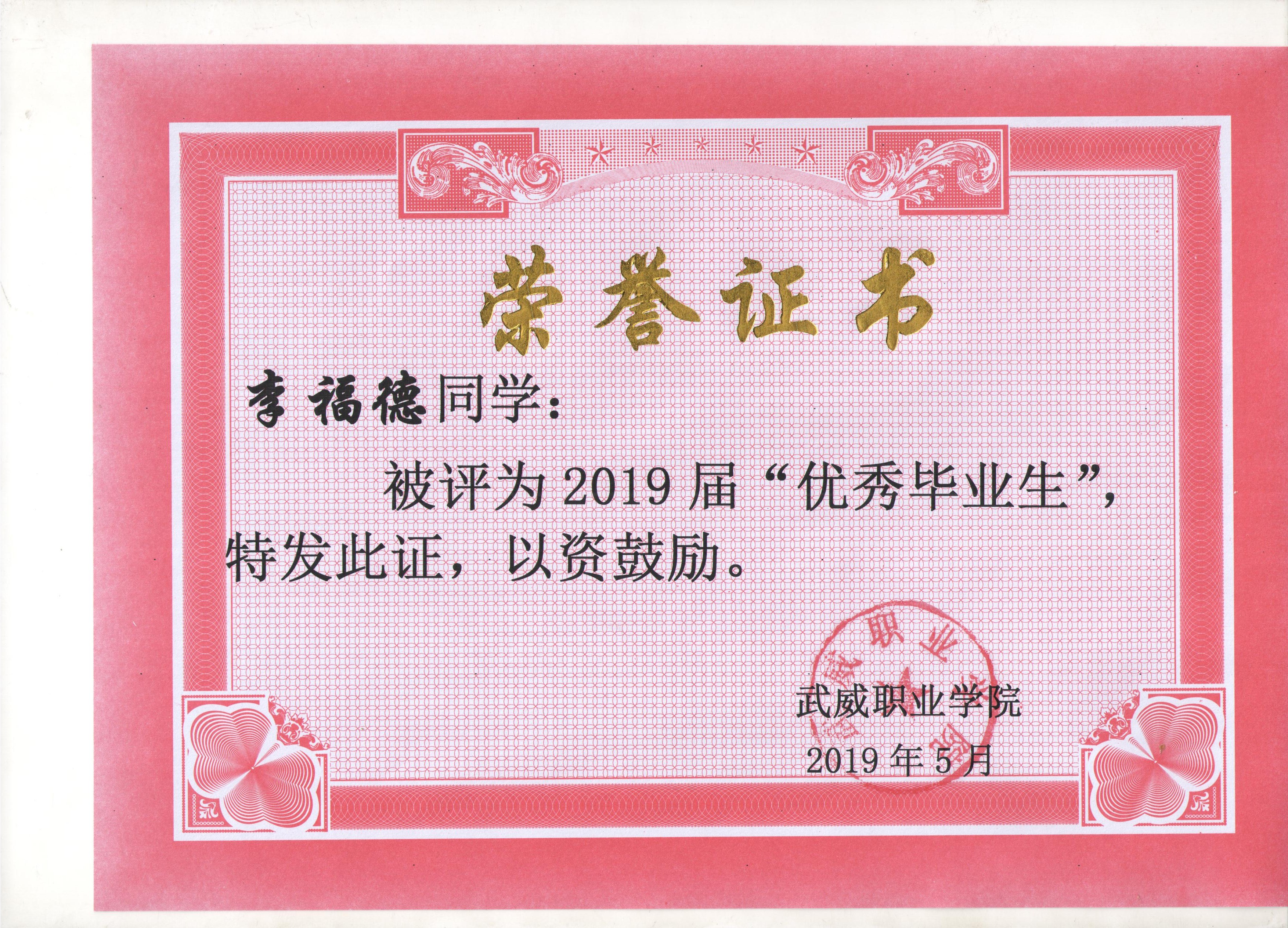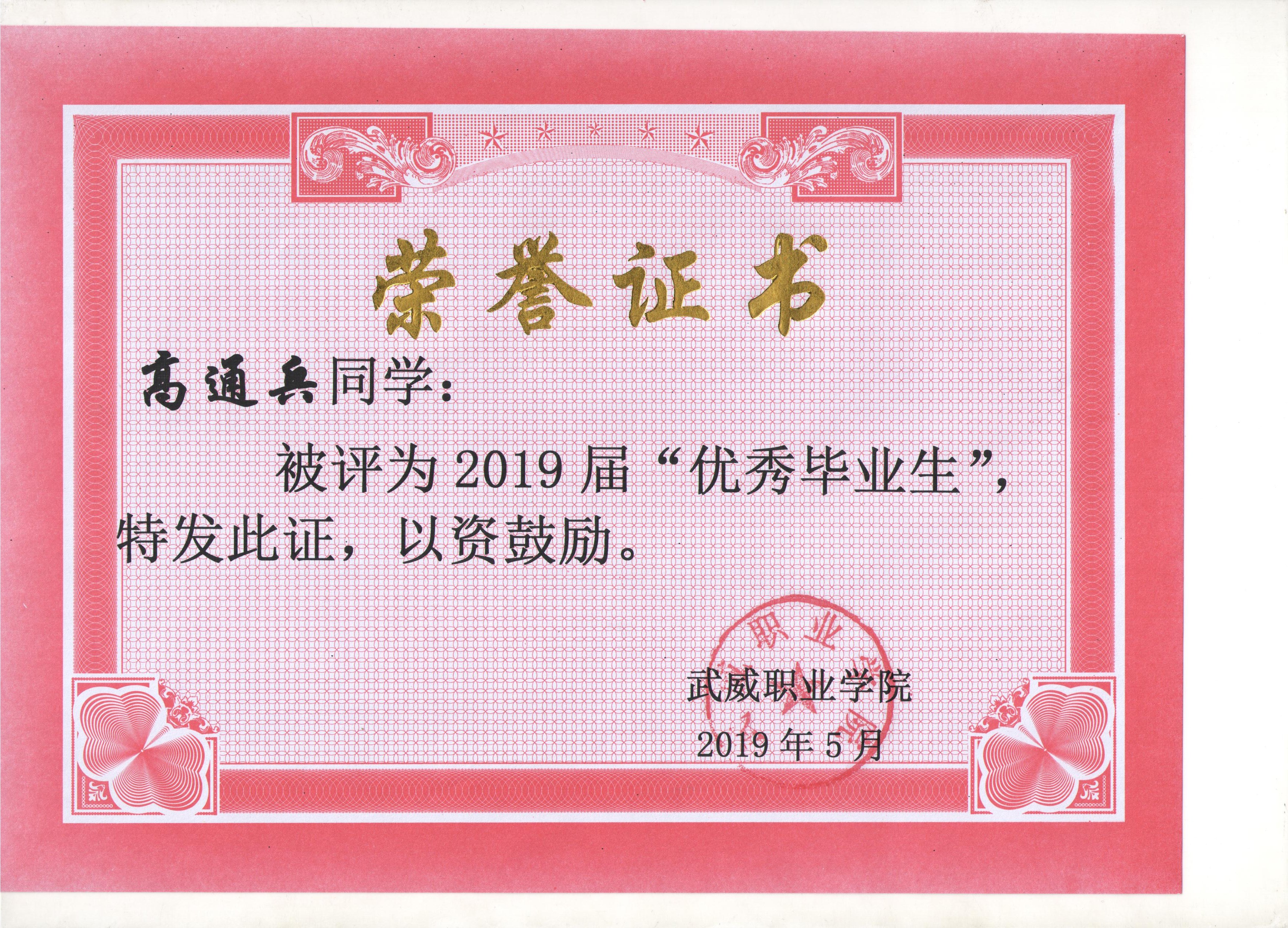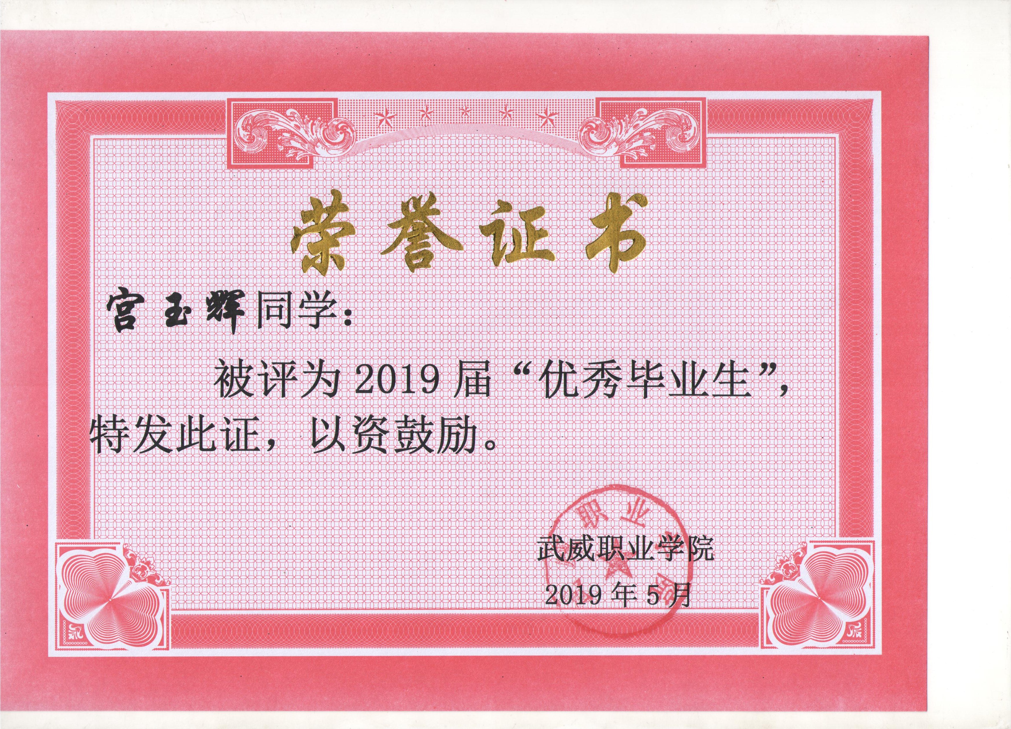 我系蔡少荣等19名同学荣获武威职业学院2019届“优秀毕业生”荣誉称号