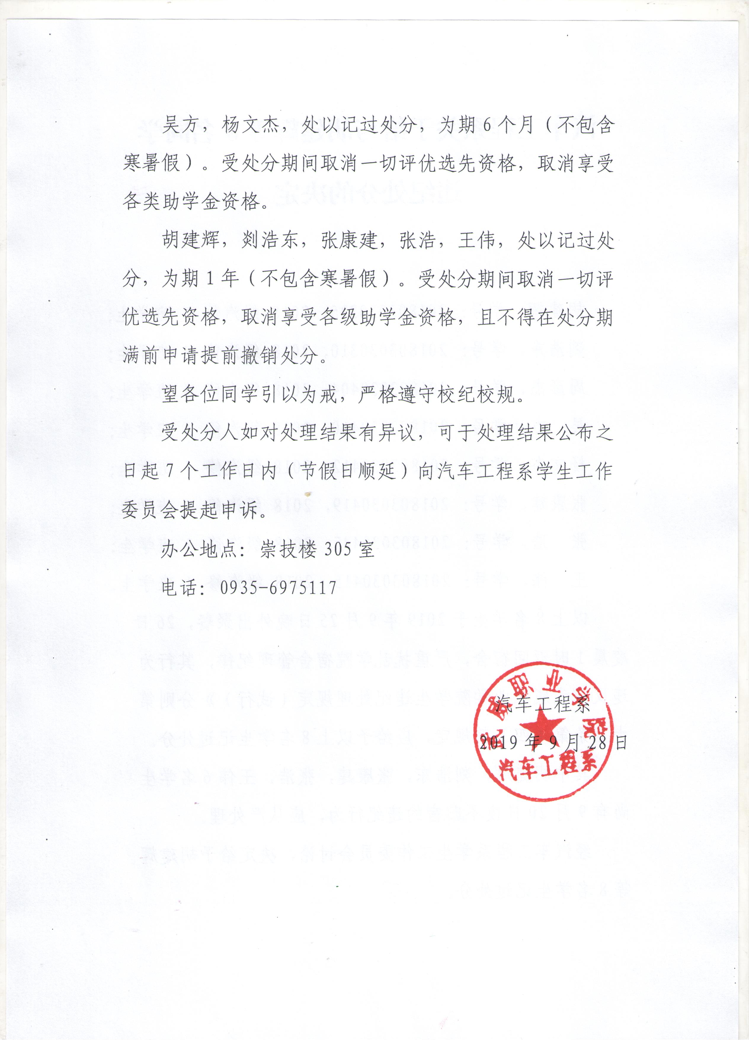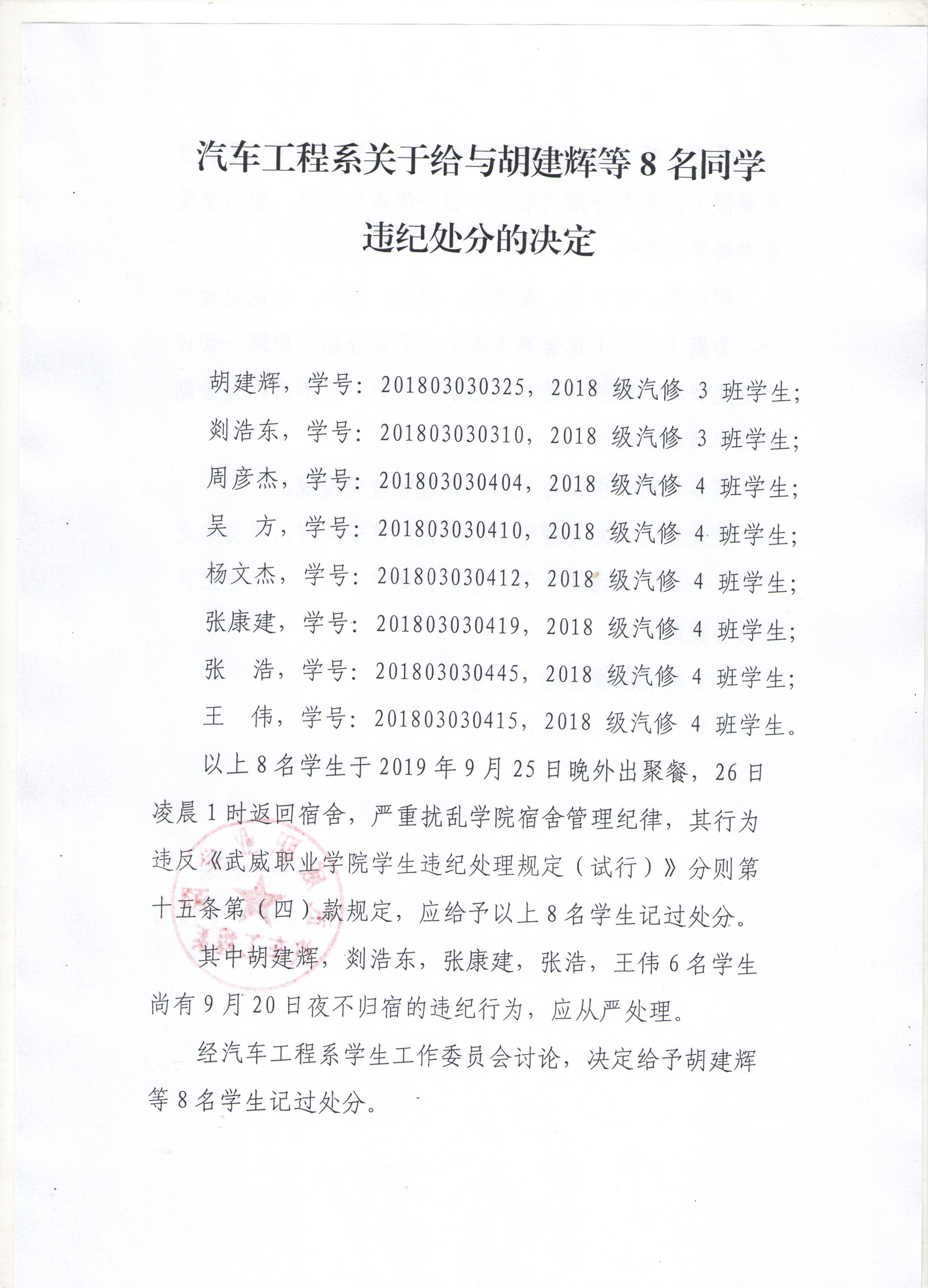 汽车工程系关于给与胡建辉等8名同学违纪处分的决定