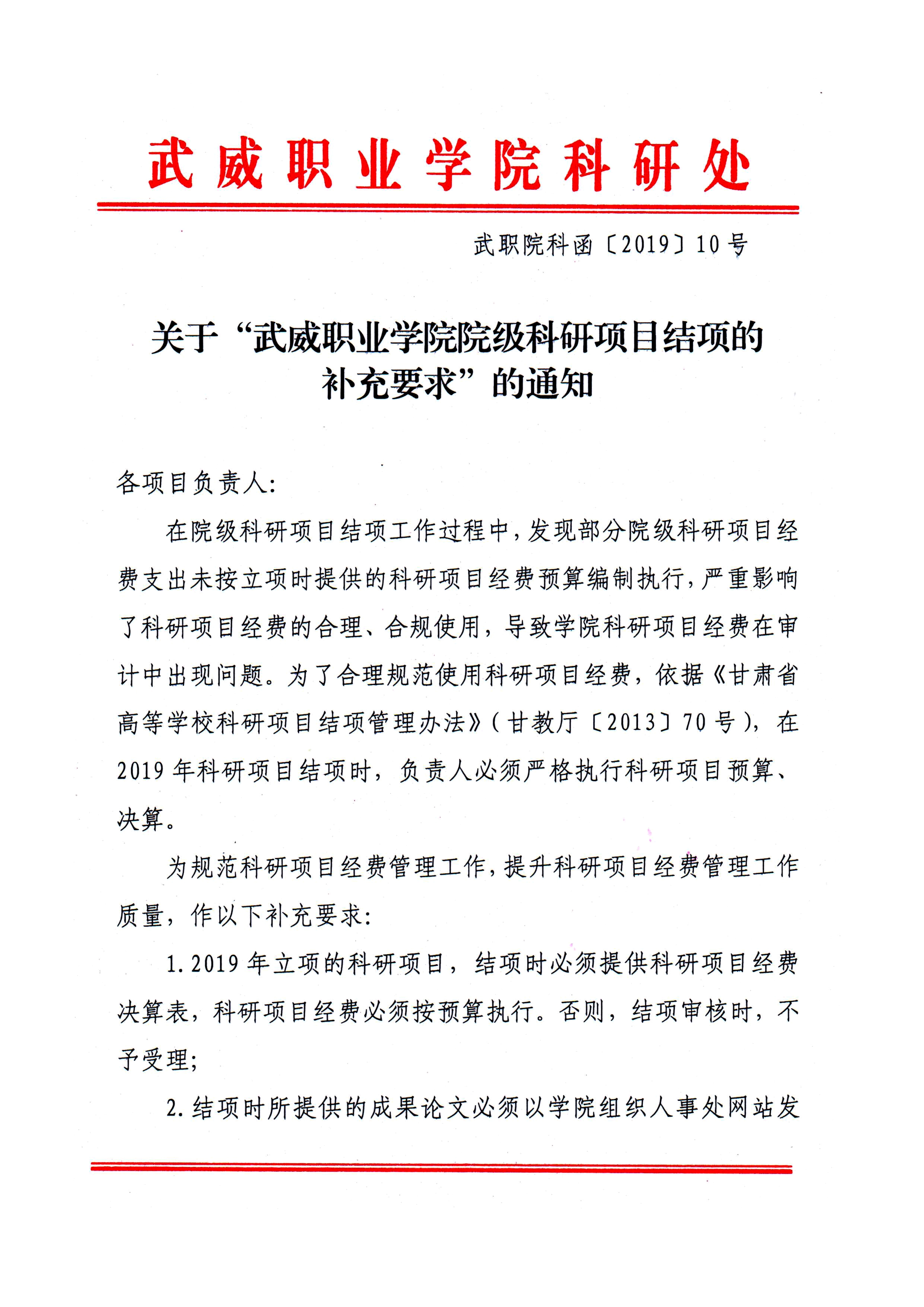 关于“武威职业学院院级科研项目结项的补充要求”的通知