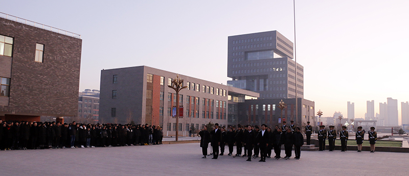 上午7时50分,国旗班踏着铿锵有力的步伐步入升旗台,鲜红的五星红旗在雄壮的国歌声中冉冉升起。警笛鸣响,在场师生肃立,为遇难同胞默哀致敬。26名学生代表深情朗诵《和平宣言》,代表学院全体师生发出庄严的和平宣言。