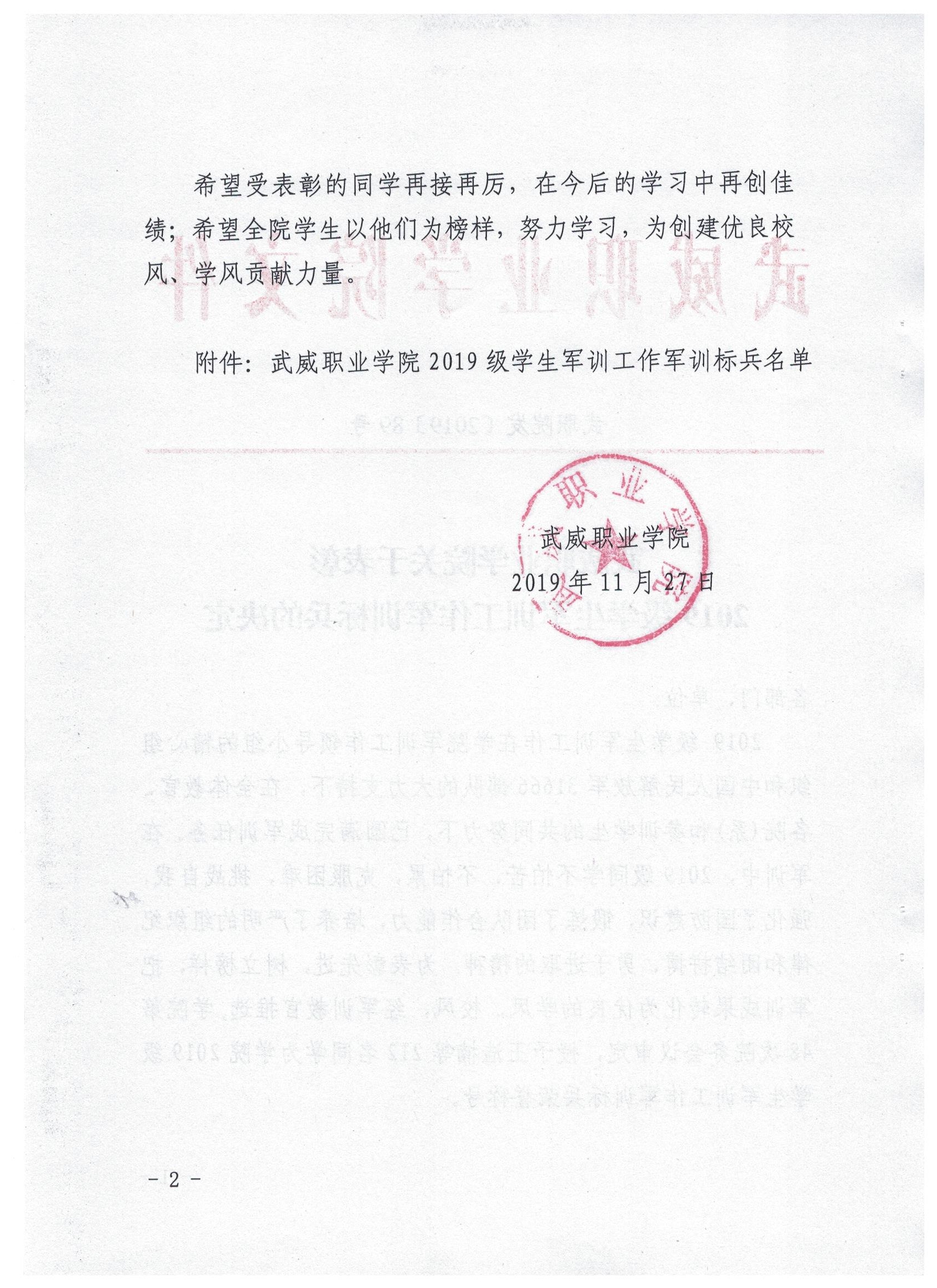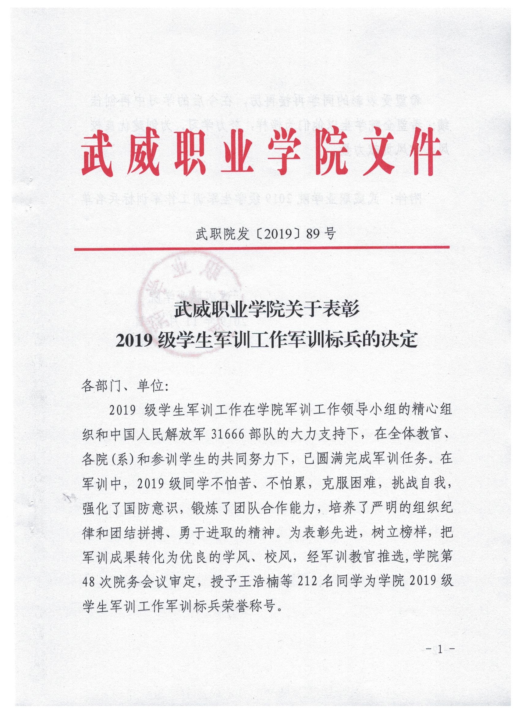 武威职业学院关于表彰2019级学生军训工作军训标兵的决定