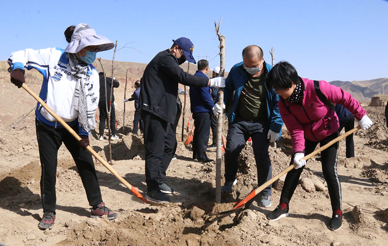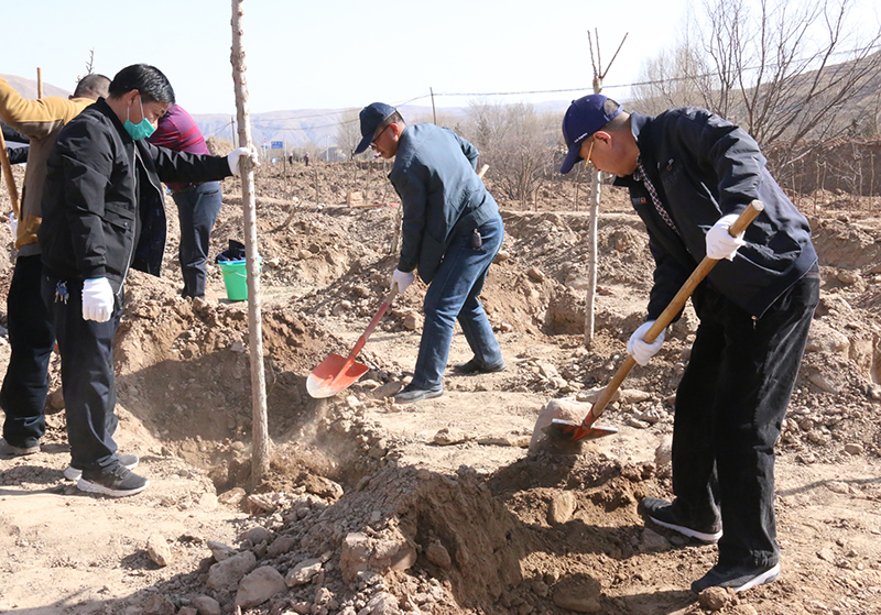 春风吹拂处,新绿绽枝头。为深入学习贯彻习近平总书记视察甘肃的重要讲话和批示精神,认真践行绿水青山就是金山银山的发展理念,实施绿色发展战略,进一步加强祁连山生态环境保护与治理,帮助帮扶镇打赢脱贫攻坚战,实施乡村振兴战略,4月9日,学院领导班子成员、帮扶干部、驻村干部及部分教职工70多人深入结对帮扶镇——黑松驿镇开展义务植树活动,建设“生态示范林”。春光沐浴的祁连山脚下黑松驿镇,春意盎然,生机勃勃,正是植树好时节。广大教职工一下车就拿起铁锹到植树现场,与黑松驿镇政府部分干部一起投入植树活动,按照“横看直线侧一线、三埋两踩一提苗”的技术要求,三人一组,分工协作,有序配合,挥锹培土、扶苖踩土、围堰浇水,现场一派热火朝天的劳动景象。当天植树育林约20余亩,一棵棵新栽的树苗整齐排列,迎风挺立。通过义务植树,广大教职工用实际行动传播着生态文明、绿色发展理念,切实帮助帮扶镇绿起来,美起来,富起来。