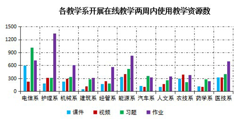 开展在线教学两周以来,通过学院在线教学平台管理后台数据整理分析,教师为在线授课准备了充足的教学资源。两周内,学院教学平台新上传教学课件2527个,教学视频2701个;新设置课堂练习题4176道,发布课后作业题6375道,丰富的资源有力支持在线教学顺利进行。