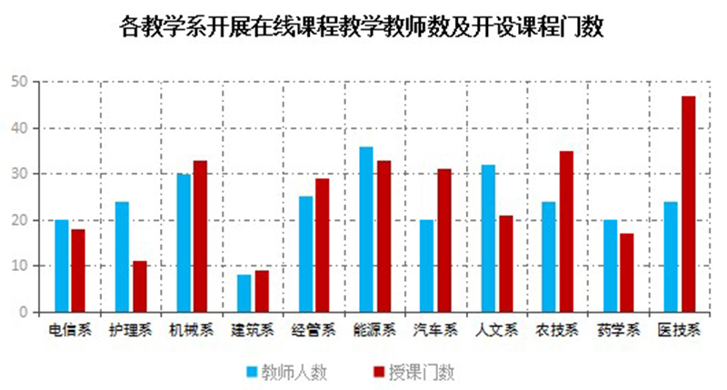 根据学院教学平台管理数据和各教学系反馈数据,开课两周内全院开展在线教学教师共有263人,开设课程284门;学院两周内授课课时总数达到1949学时,教师开展在线教学3334人次;发布作业共计1306次,组织答疑讨论1918次。教师教学形式灵活多样,对教学平台及教学工具的熟练程度逐渐提升,教师讨论交流的主题从基础性的上传资源、组织教学、组织教学等转变为作业发布、主题讨论、学情数据分析,在线教学工作步入正轨。