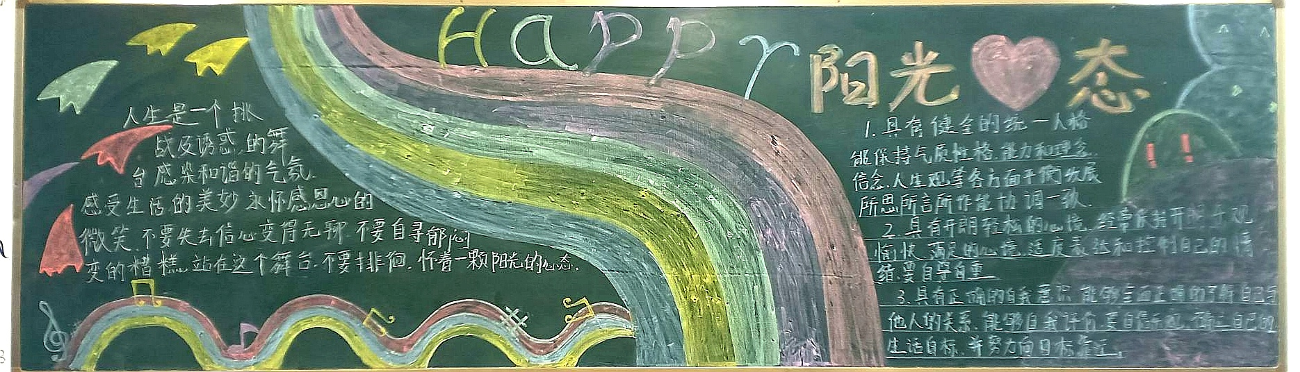 为进一步提高大学生的心理素质,促进大学生的身心健康和谐,宣传普及心理健康知识,深入开展心理健康教育,我系结合学院特点,突出专业优势,在积极承担和参与学校心理健康活动月的团日活动的同时,各班开展了丰富多彩的以“心理健康”为主题的黑板报。