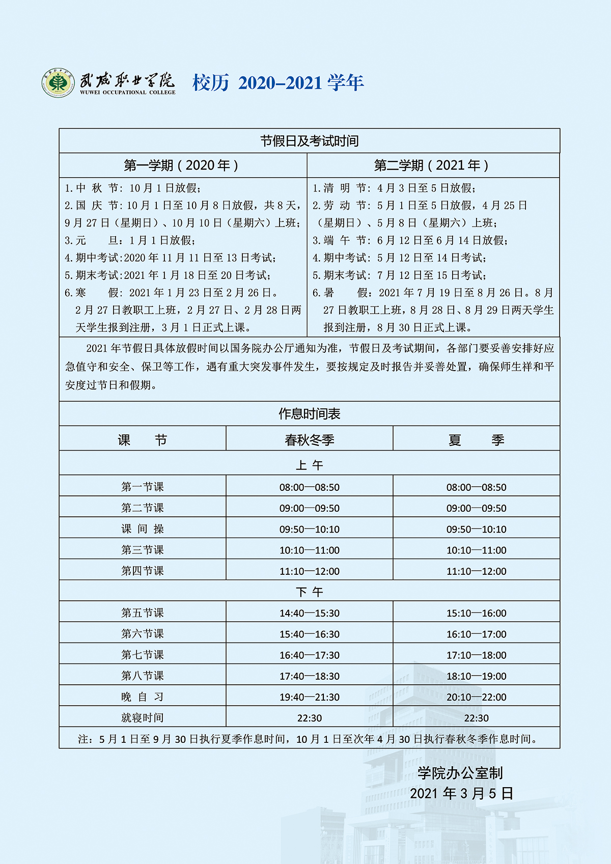 2020-2021学年校历