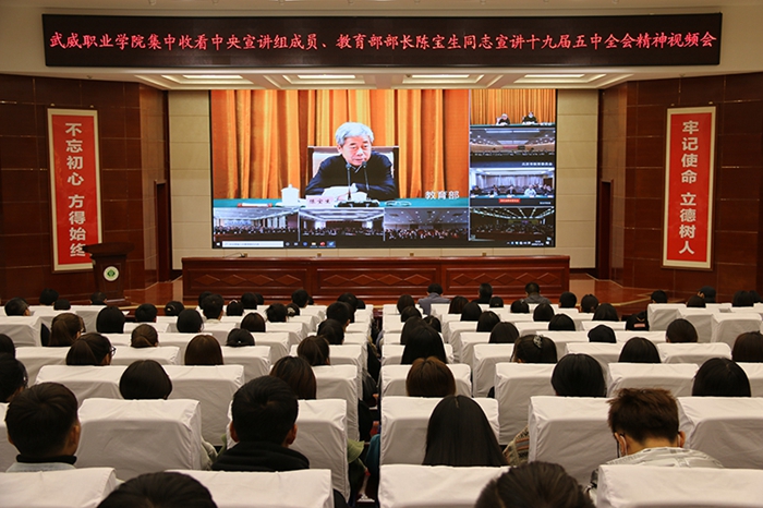 武威职业学院组织党员干部和师生观看教育部党组书记、部长陈宝生宣讲十九届五中全会精神