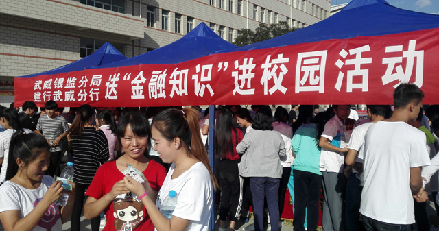 为帮助和引导大学生群体牢固树立金融安全意识,9月13日下午,武威银监分局联合建行武威分行在武威职业学院尚德楼南操场开展了“送金融知识进校园”宣传活动。