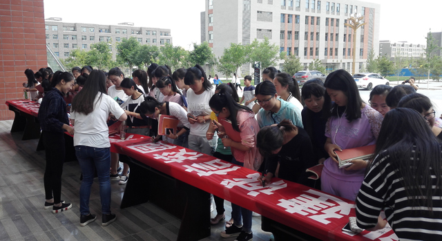 6月14日是第九个全国“信用记录关爱日”。为进一步加强我院学生的诚信教育,结合当前学院正在进行的社会信用体系建设及国家助学贷款工作,当日中午12时,学生工作处在大学生活动中心广场发起“创建诚信校园 树立诚信学风 做诚信学子”的主题签名倡议活动。200多名学生顶着炎炎烈日前来参加签名活动,并在横幅上郑重签下了自己的名字。