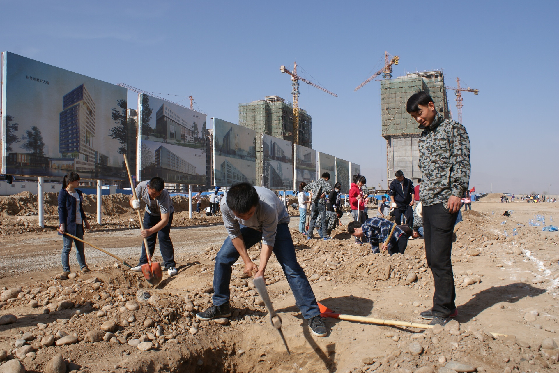 植树现场一派忙碌的景象,大家有秩序地领取工具,三五一组,分工明确,挥动镐头,掘土挖坑,再将一颗颗树苗埋窝、培土、踩实、浇灌。经过三天的紧张劳作,我系师生在指定区域完成了280个树坑的开挖和树木栽植任务。