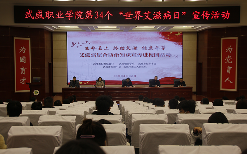 11月30日,学院在菁英厅开展了“生命至上 终结艾滋 健康平等”艾滋病综合防治知识宣传进校园活动。市疾控中心工会主席张富国、市妇联副主席张惠华、学院党委委员、副院长王守云,市第二人民医院院长滕亮出席活动,活动由学院护理系党总支书记张建辉主持,市红十字会、市疾控中心、天马行市民云数据有限公司工作人员及武威职业学院师生代表参加活动。
