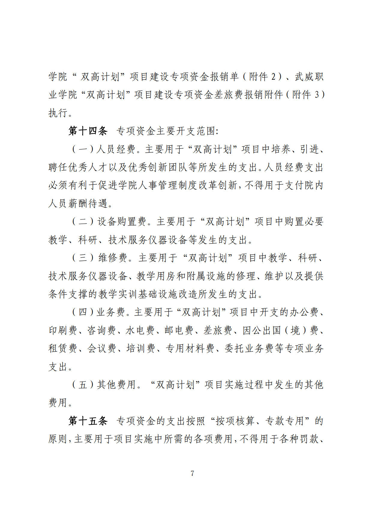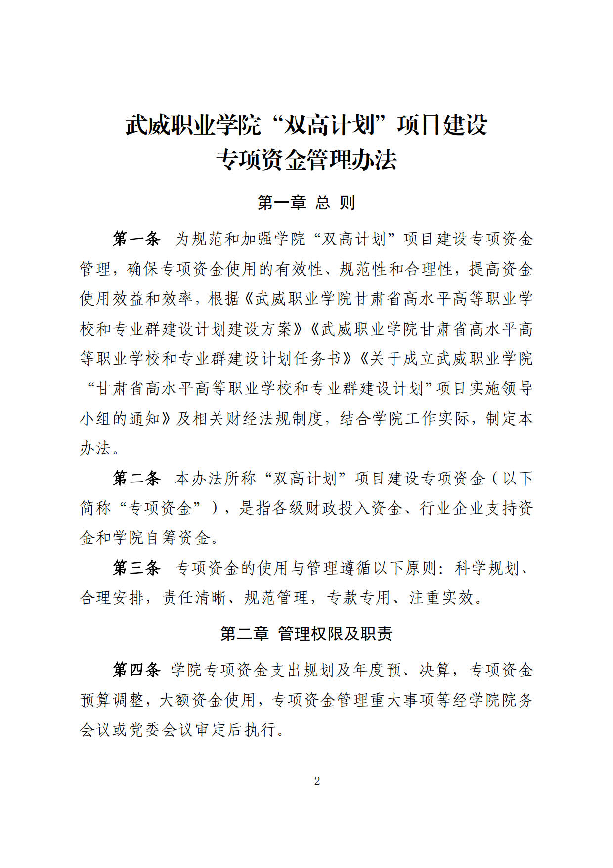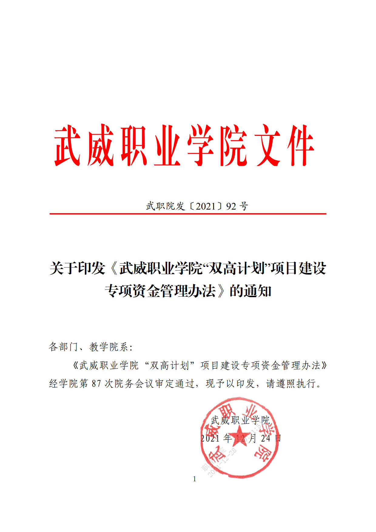 关于印发《武威职业学院“双高计划”项目建设专项资金管理办法》的通知