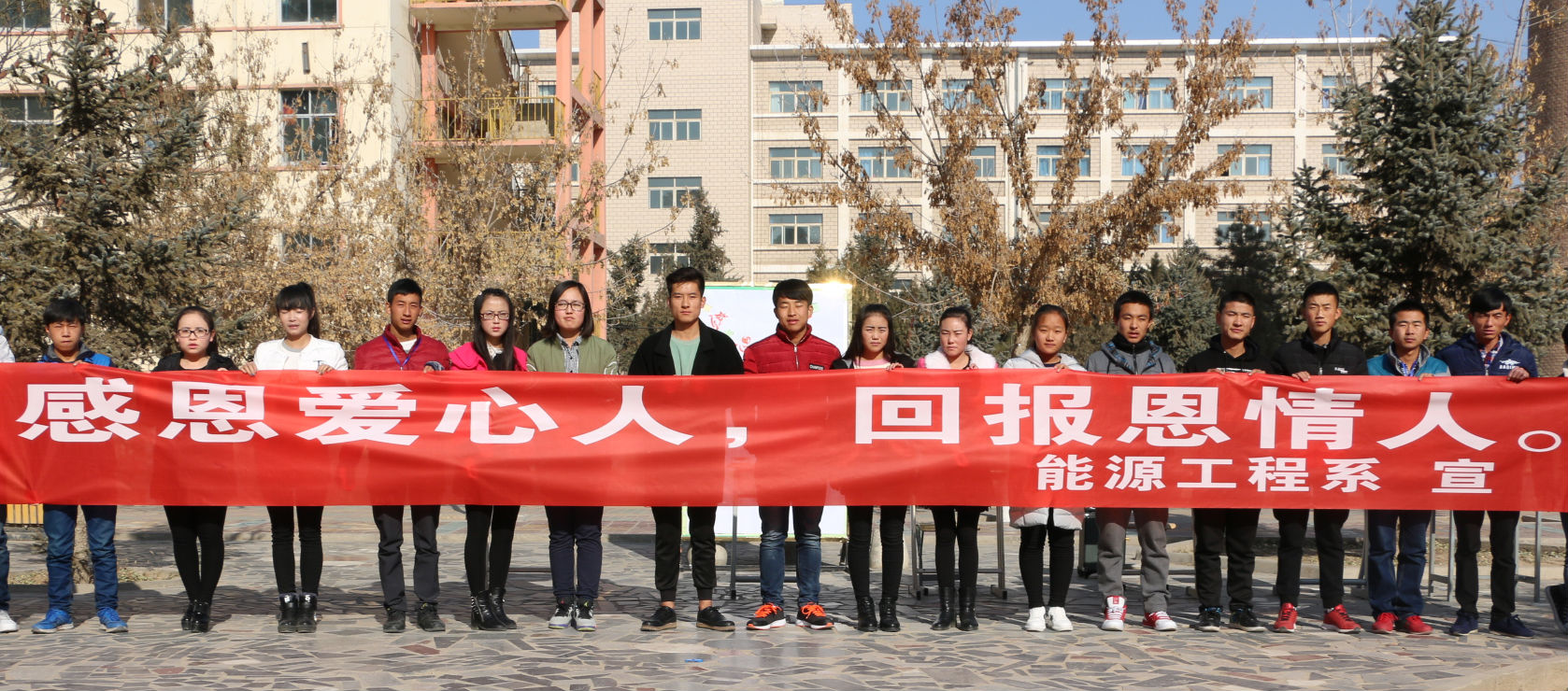 为了成长为合格的祖国建设者,为实现中国梦。2016年11月24日,武威职业学院能源工程系在一号食堂门口,举行了以“感恩爱心人,回报恩情人”为主题的活动,出席本次活动的有能源工程系全体学生会成员。