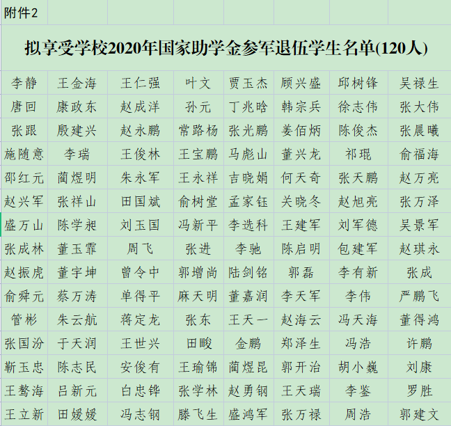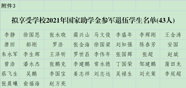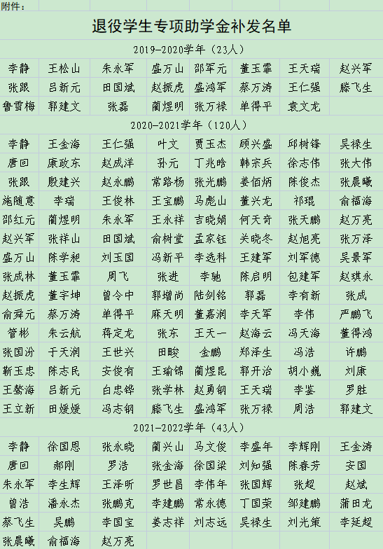 根据《甘肃省财政厅 甘肃省教育厅关于下达 2021年学生资助补助经费(第二批)的通知》(甘财教〔2021〕68号)和《甘肃省学生资助资金管理办法》(甘财教〔2022〕20号)文件要求,学生工作处拟对2019—2020学年符合资助条件的23名退役学生每人补发助学金3300元,共计75900元;对2020—2021学年符合资助条件的120名退役学生每人补发助学金3300元,共计396000元;对2021—2022学年符合资助条件的43名退役学生每人补发助学金3300元,共计141900元。现向广大师生进行公示。