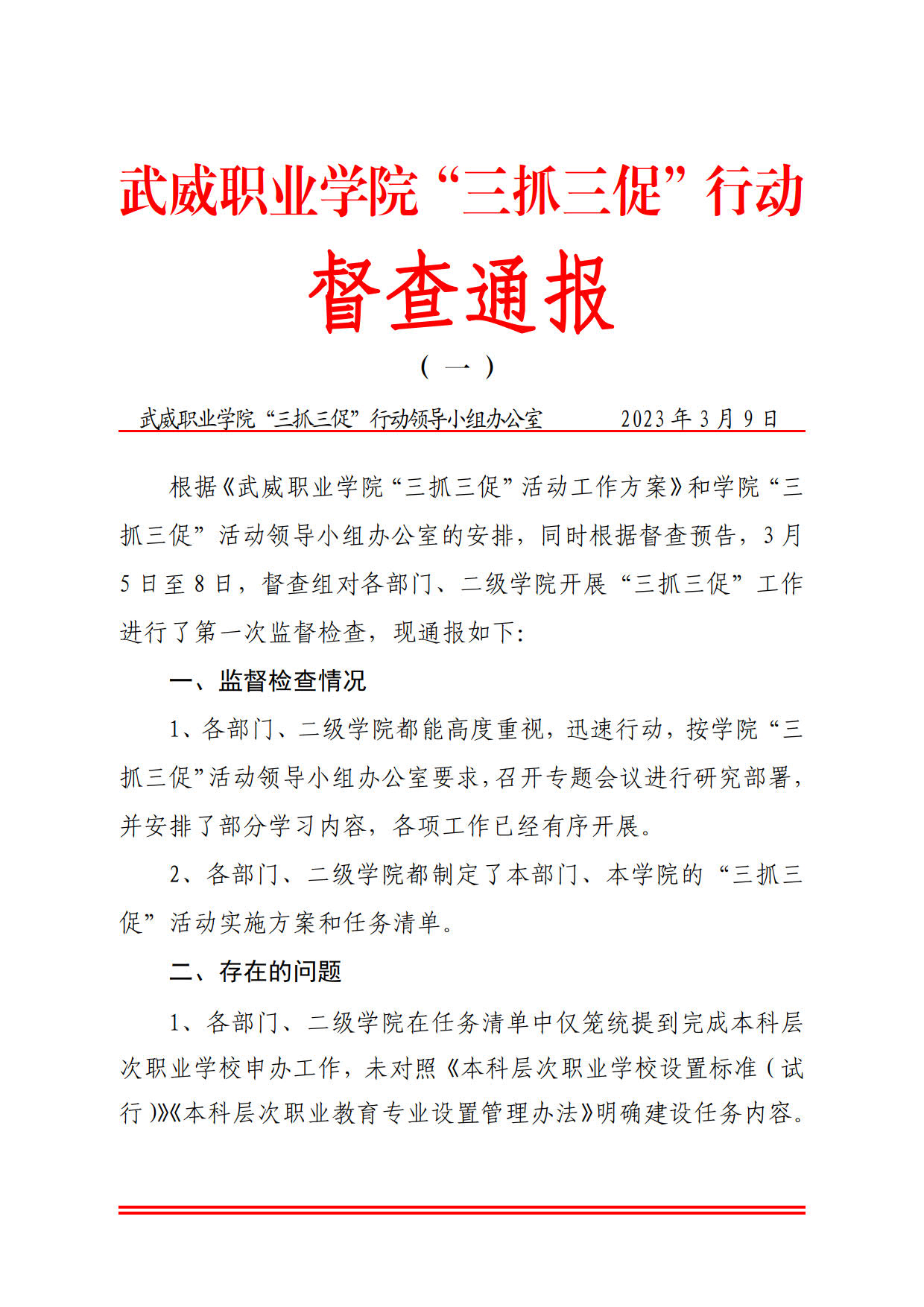武威职业学院“三抓三促”行动督查通报(一)