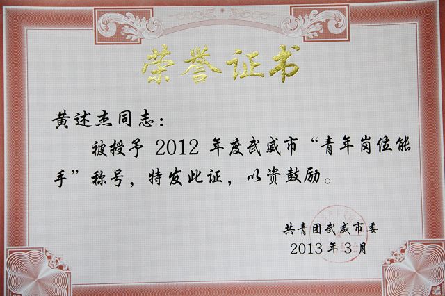 3月8日,在共青团武威市二届七次全委会上,团市委表彰了2012年度先进集体和个人,我系团总支被评为“武威市五四红旗团支部”,系团总支书记黄述杰老师被评为“武威市青年岗位能手”,11级光伏发电技术及应用大专班张凤凤同学被评为“武威市优秀共青团员”。