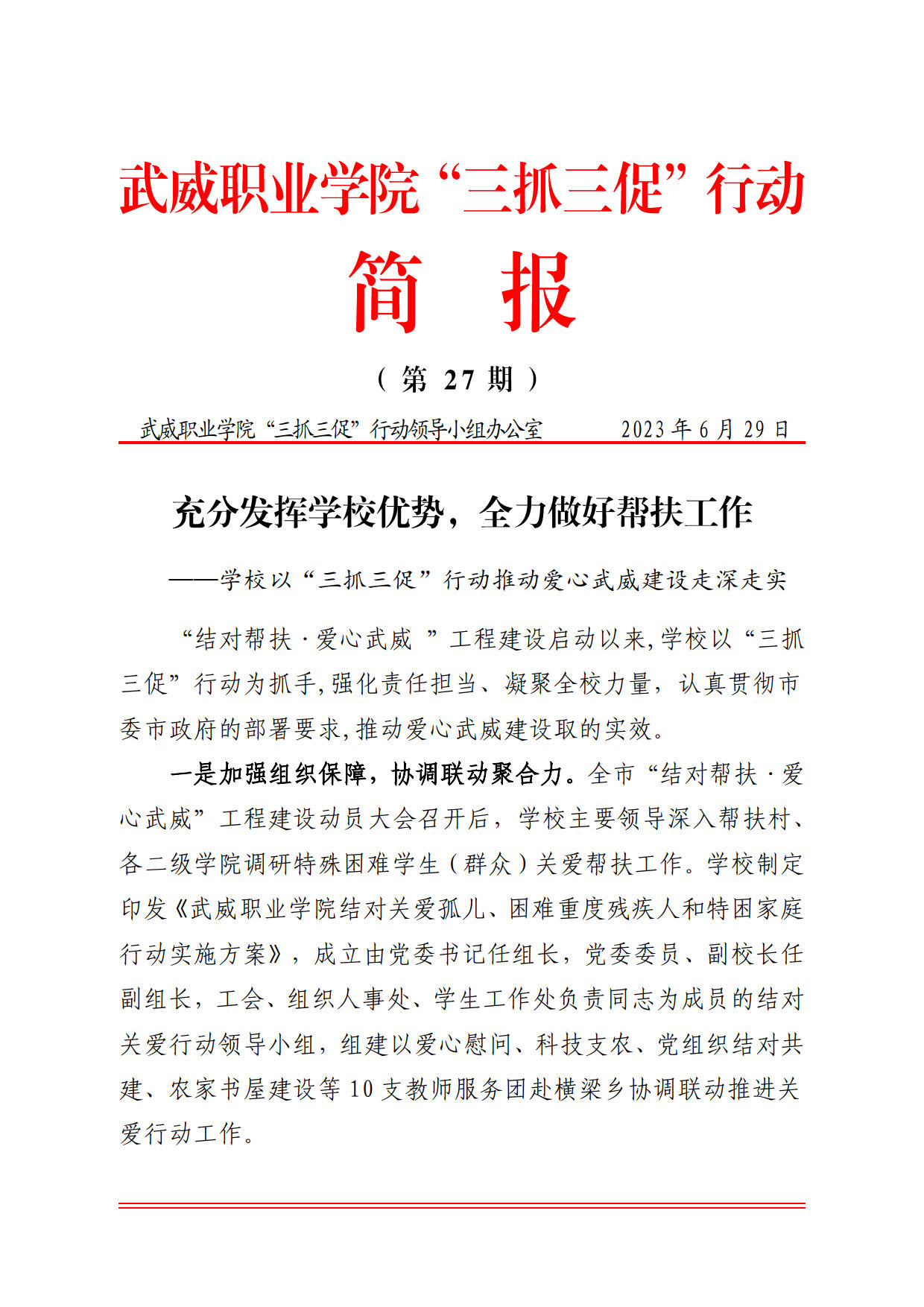 简报第27期:充分发挥学校优势,全力做好帮扶工作——学校以“三抓三促”行动推动爱心武威建设走深走实