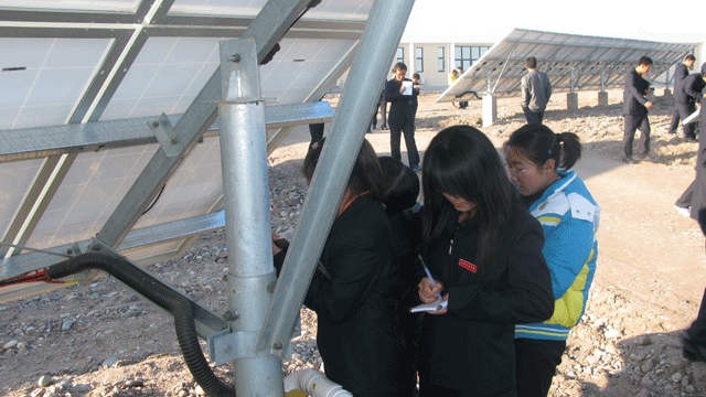 在观摩学习过程中,全体师生受到了园区管委会工作人员的热情接待,管委会张国伟主任带领师生参观了中节能甘肃武威太阳能发电有限公司,公司负责人向大家介绍了园区建设情况,从多晶硅、单晶硅的提炼、太阳能电池板的生产制造到光伏电站的建设,对光伏发电产业链进行了较详尽的讲述。同学们看到园区内一排排整齐摆置的太阳能电池板方阵时,都流露出激动崇敬的神情,一个个边走边看,并伸手触摸太阳能电池板。同学们就光伏发电的原理、电池使用寿命、光电转换效率以及光伏电站的运行维护等方面的专业知识向负责人请教,面对大家的疑问,园区负责人都耐心细致的做了解答。