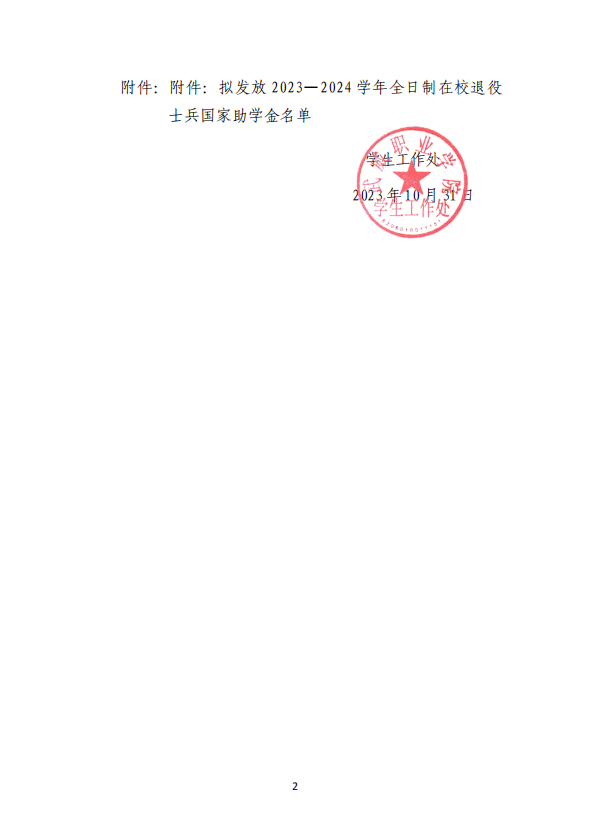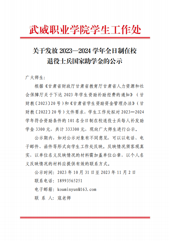 关于拟发放2023—2024学年全日制在校退役士兵国家助学金的公示