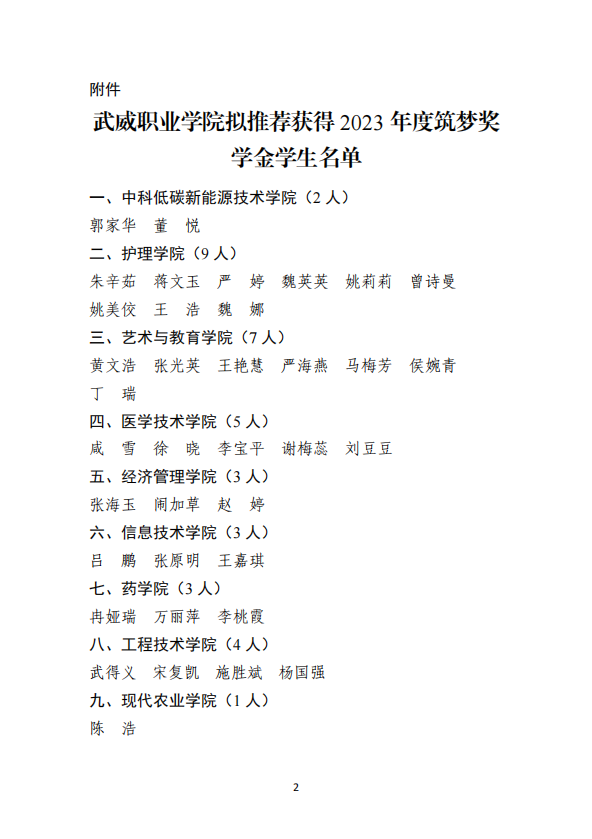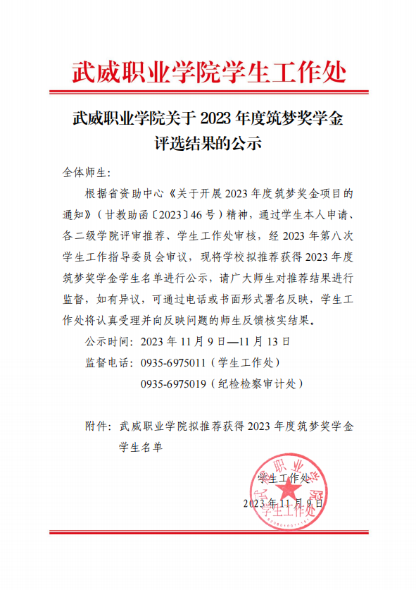 武威职业学院关于2023年度筑梦奖学金评选结果的公示