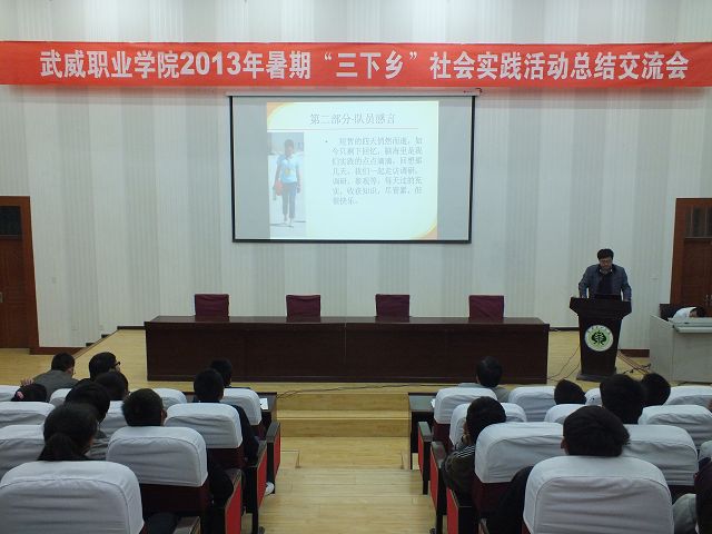10月14日下午,武威职业学院2013年暑期“三下乡”社会实践活动总结交流会在东阶梯教室举行,学院团委负责人及各实践团队成员和新生团学干部代表共300人参加了交流会。