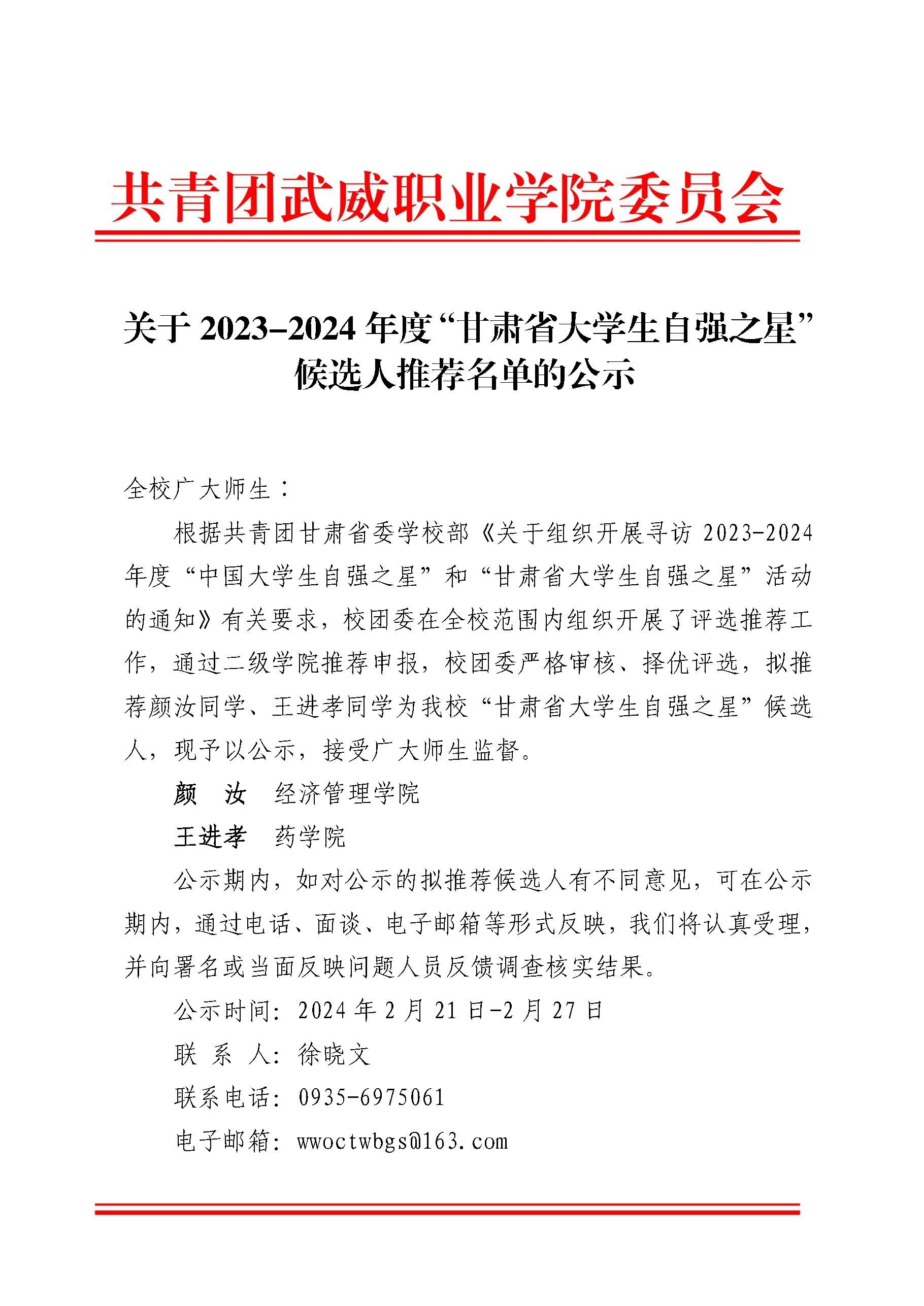 关于2023-2024年度“甘肃省大学生自强之星”候选人推荐名单的公示