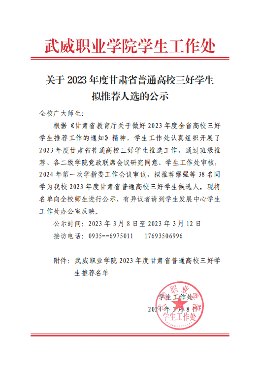 关于2023年度甘肃省普通高校三好学生拟推荐人选的公示