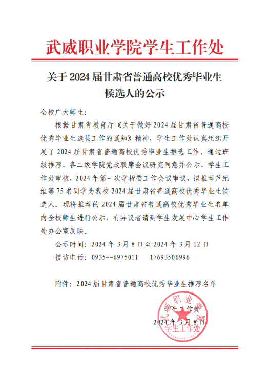 关于2024届武威职业学院优秀毕业生候选人的公示
