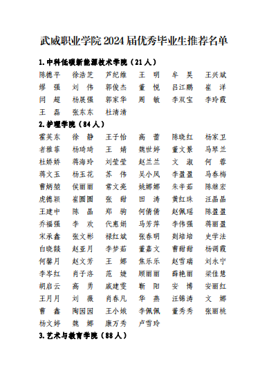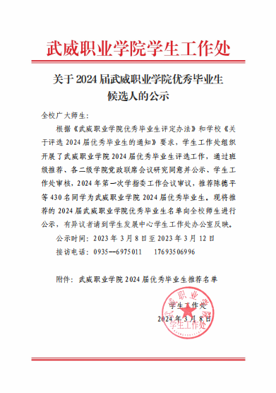 关于2024届武威职业学院优秀毕业生候选人的公示