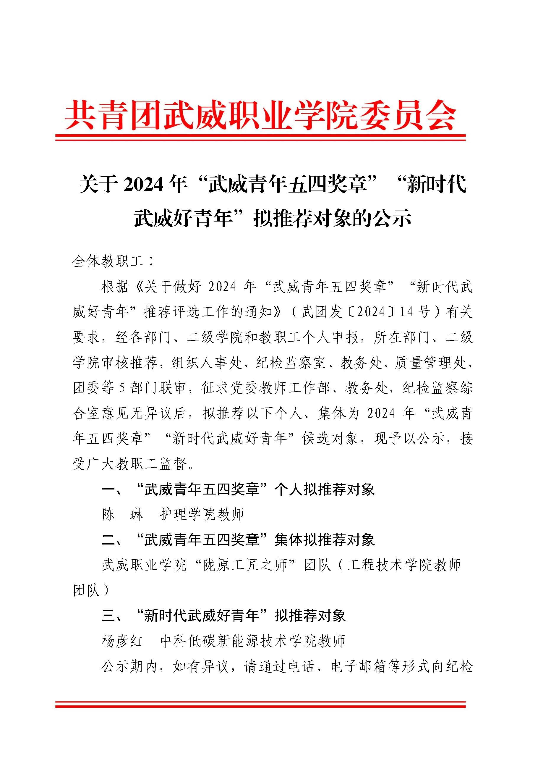 关于2024年“武威青年五四奖章“”新时代武威好青年“拟推荐对象的公示