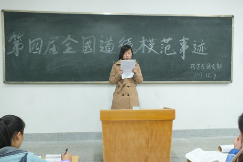 药学系团总支于2013年12月9日组织全体同学深入学习了“第四届全国道德模范事迹”,一个个动人的事迹印入耳畔,他们或充满爱心、助人为乐,或见义勇为、舍身忘死,或敬老爱亲、血脉情深。