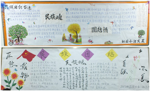 各班围绕“讴歌民族团结、共建和谐校园”主题进行了精心的设计,图文并茂,内容丰富,形式多样。大力宣传了党的民族理论和民族政策以及各民族共同团结奋斗、共同繁荣发展的民族关系。