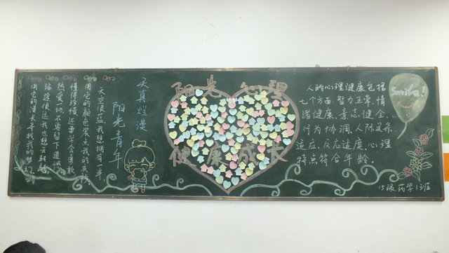 为了迎接评比,各班都做了充分的准备,认真学习了解大学生心理健康日相关知识,精心构思了板报主题内容,从心理健康辅导、心理健康实例等方面为出发点,以完善自我心理健康为关键点,充分运用了绘画、故事等素材,从多方面介绍了心理健康的核心与重要性。最后,15级药学1班《阳光心理》和15级药学2班的《心灵诊所》赢得了一致好评,14级药学2班《健康你我》清新可爱的画风,也颇受大家的喜爱。