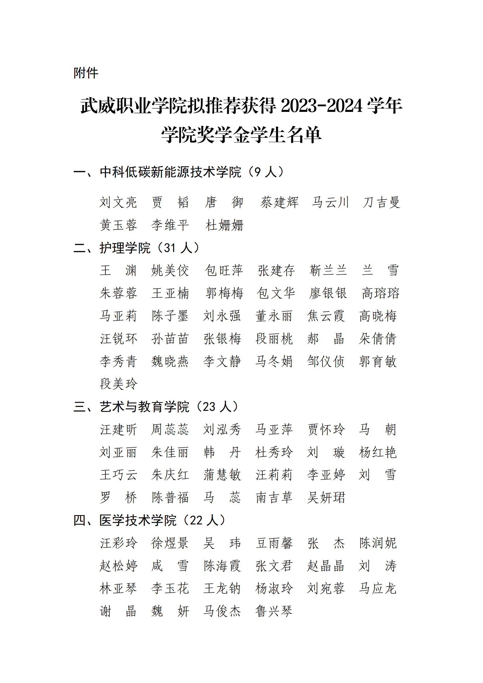 武威职业学院关于2023-2024学年学院奖学金评选结果的公示