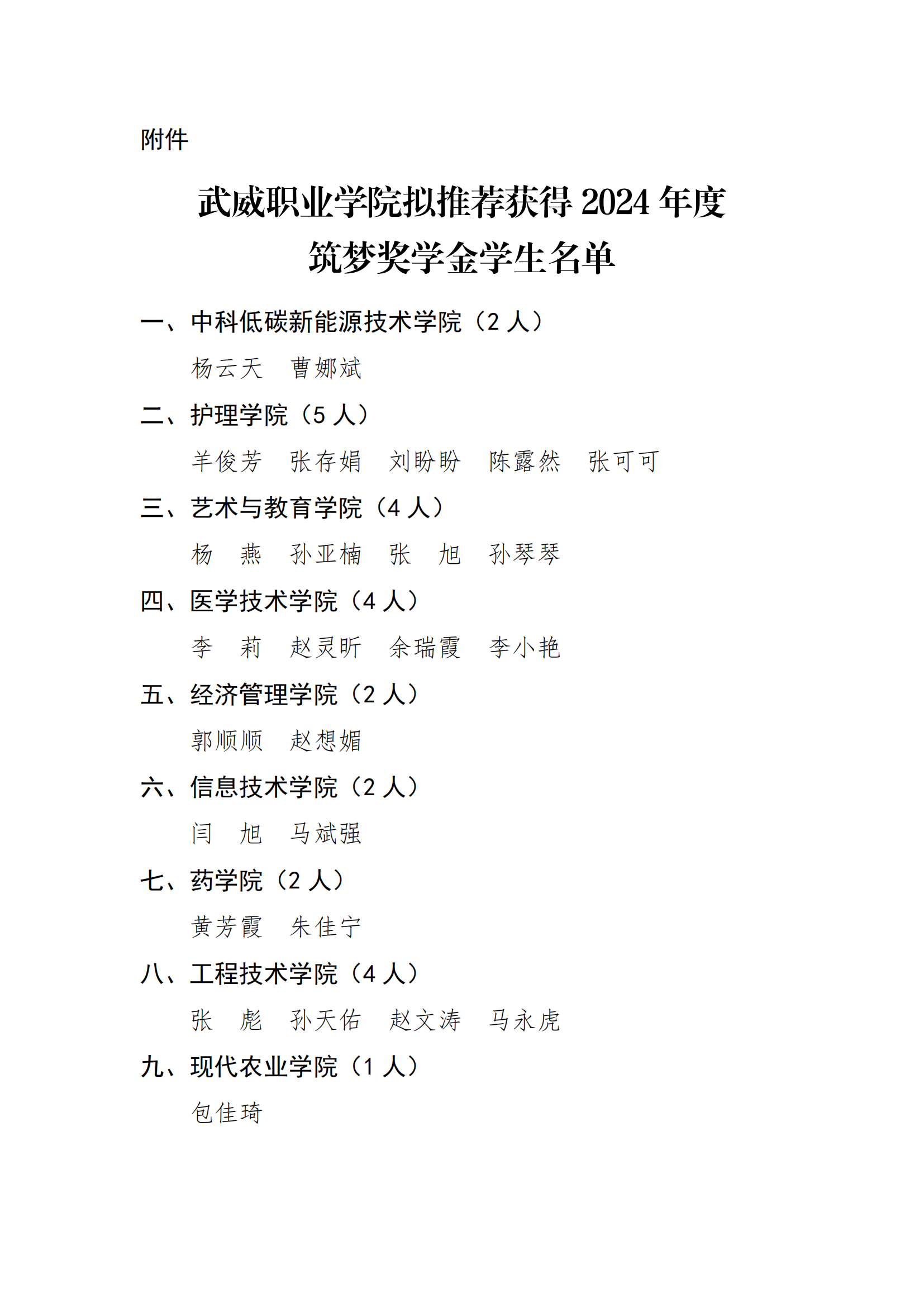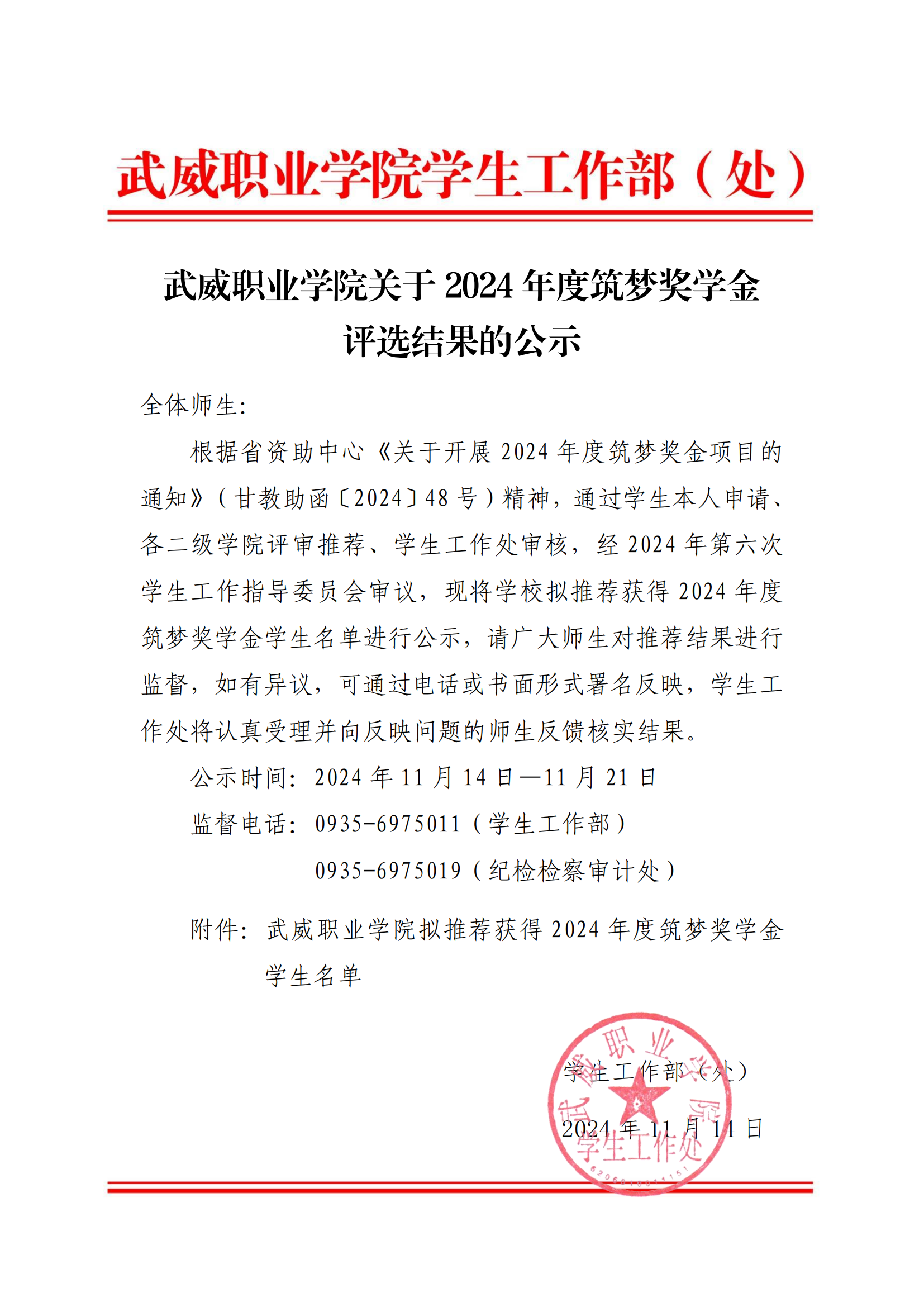 武威职业学院关于2024年度筑梦奖学金评选结果的公示