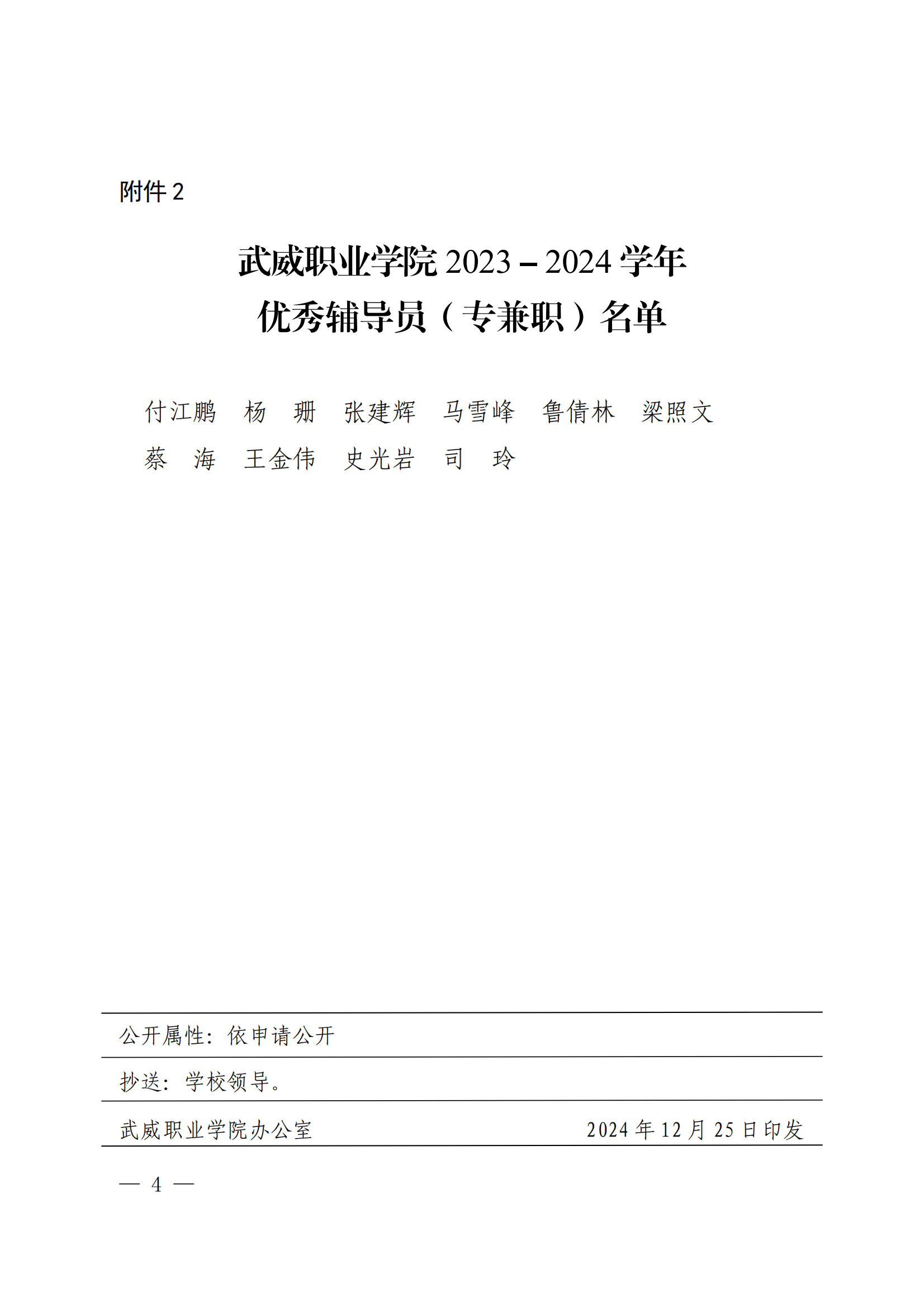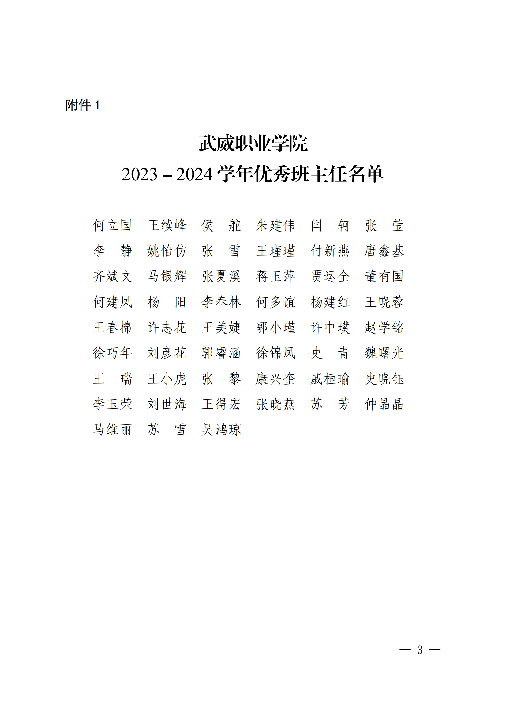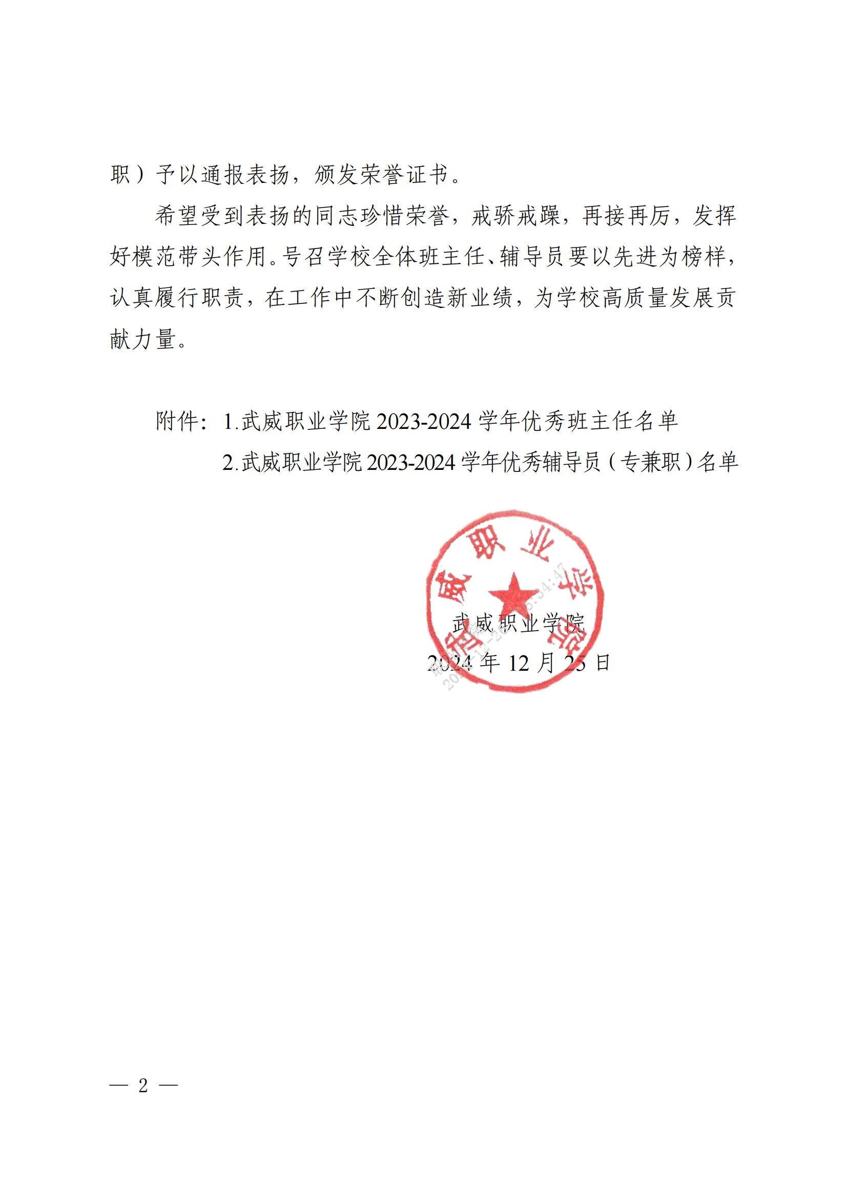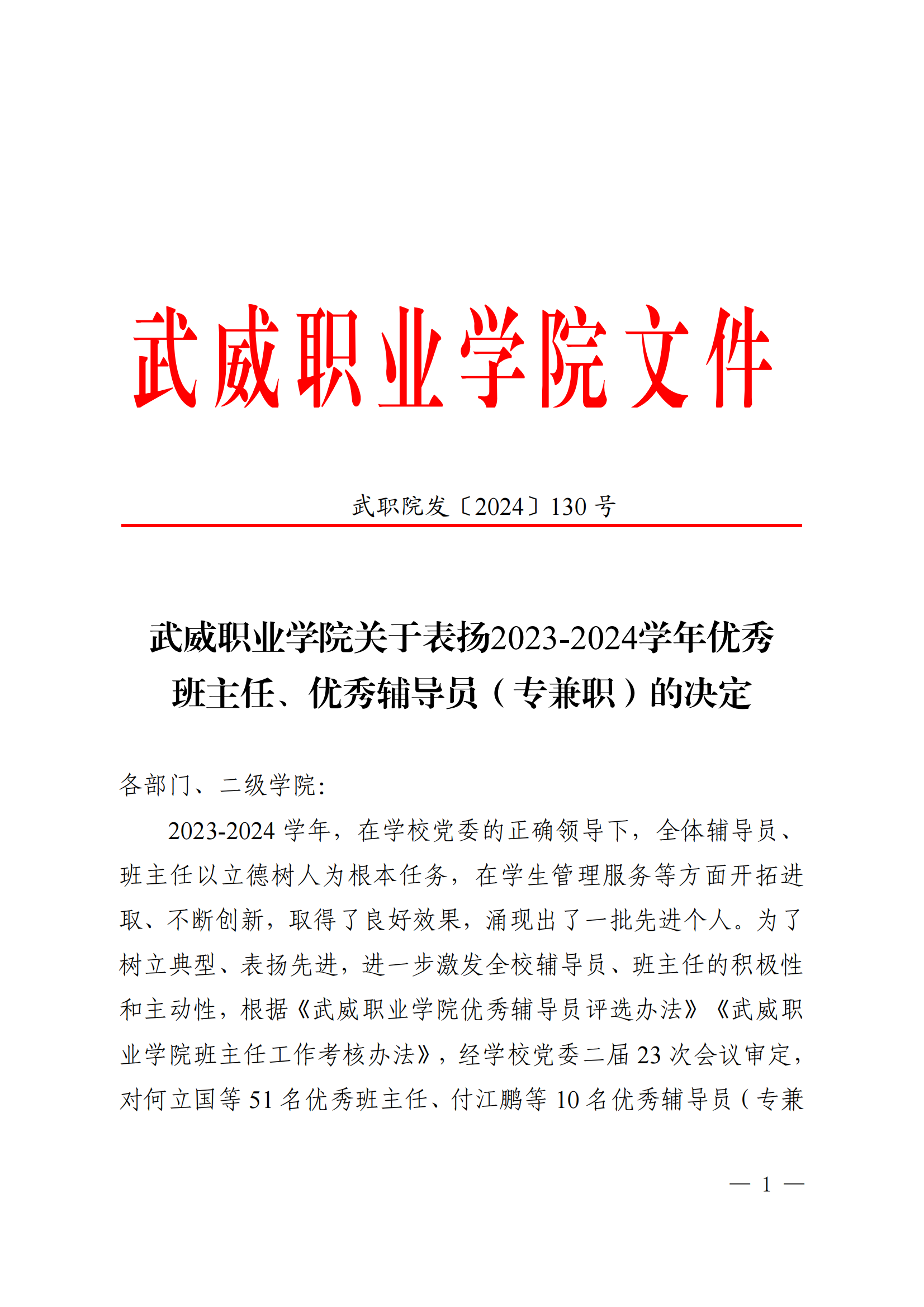 武威职业学院关于表扬2023-2024学年优秀班主任、优秀辅导员(专兼职)的决定