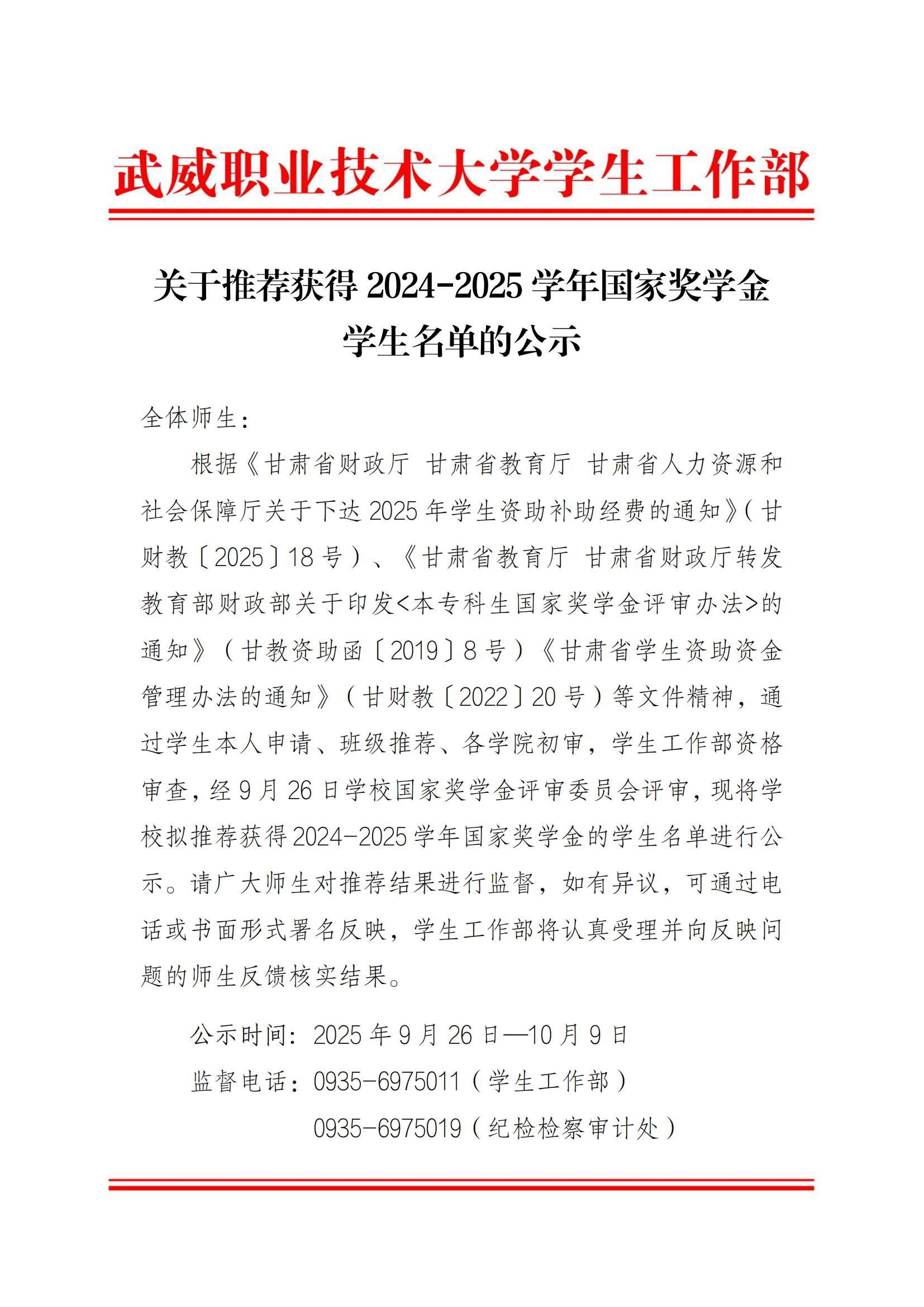 甘肃省武威师范学校关于2025-2026学年国家助学金评选结果的公示
