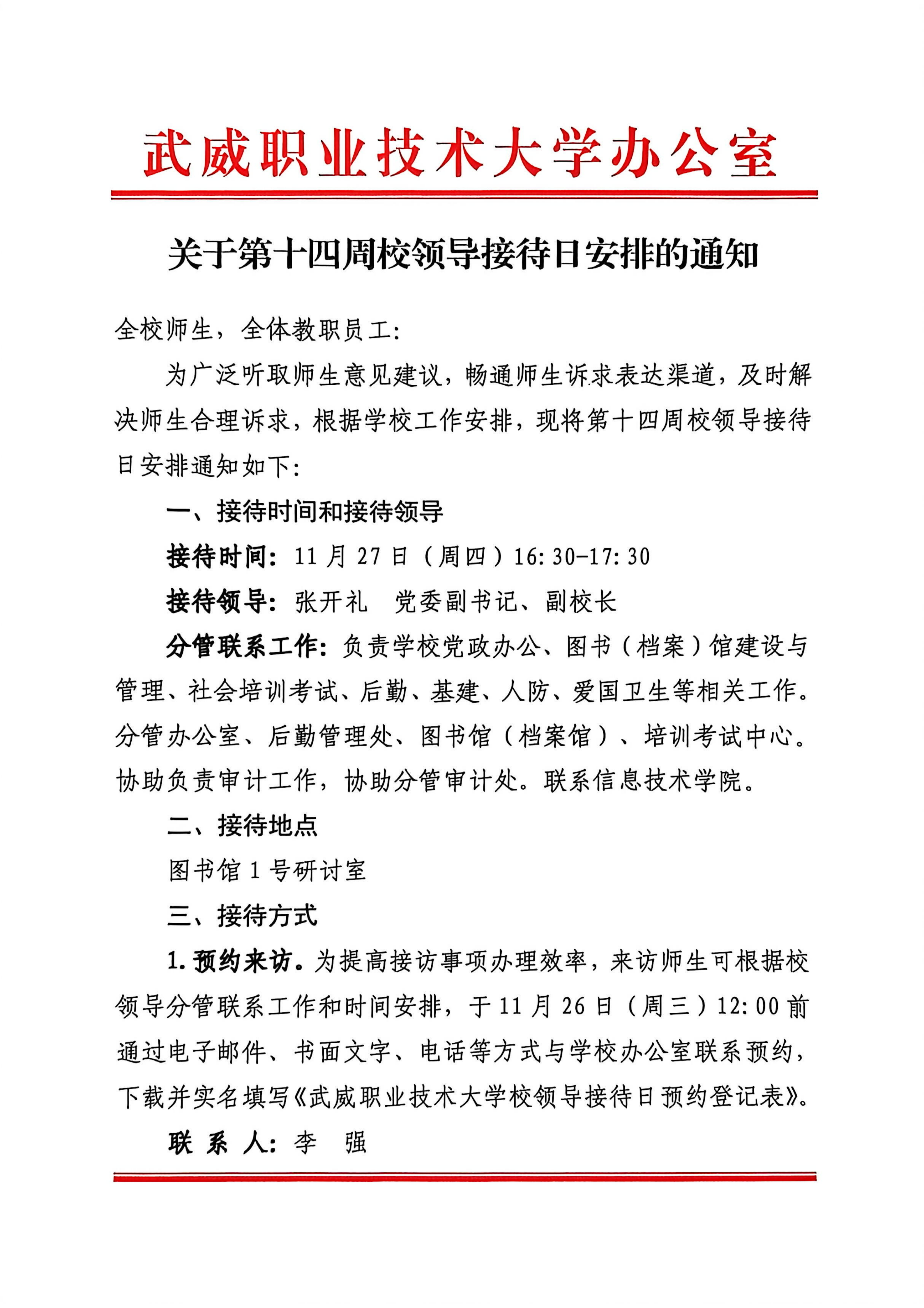 关于第十四周校领导接待日安排的通知