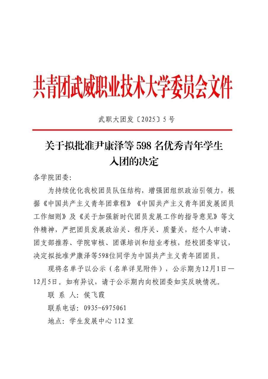 关于拟批准尹康泽等598名优秀青年学生入团的决定