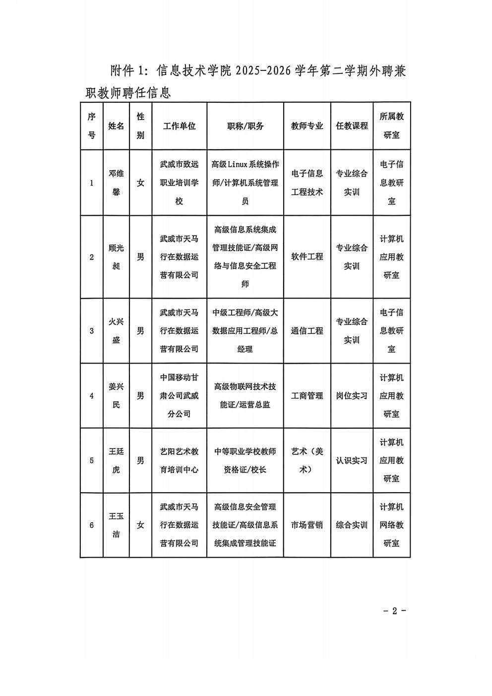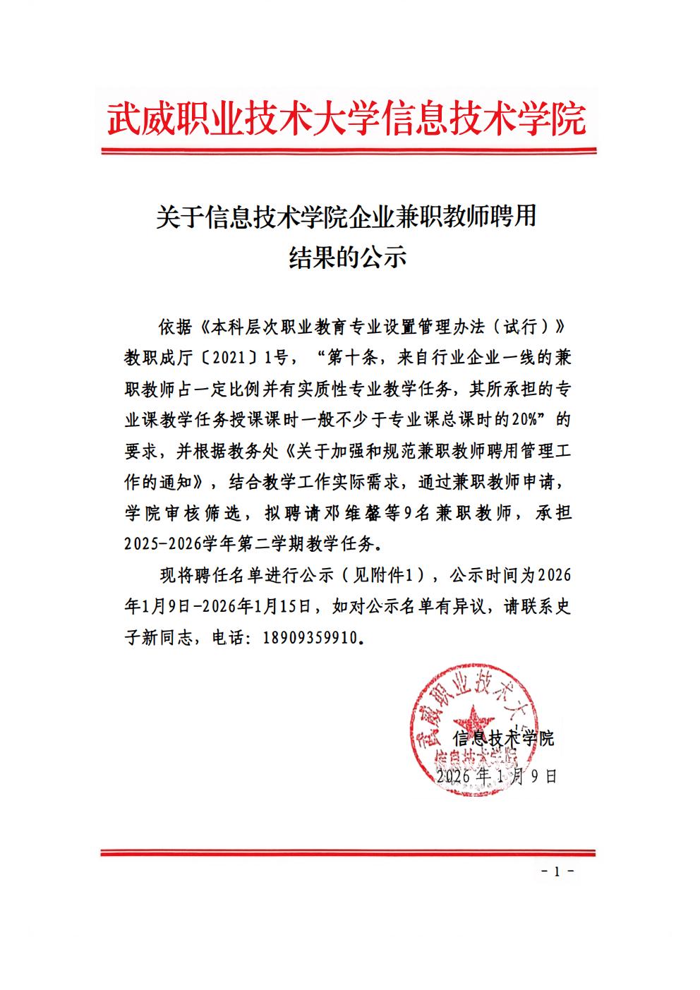关于信息技术学院2025-2026学年第2学期企业兼职教师聘用结果的公示