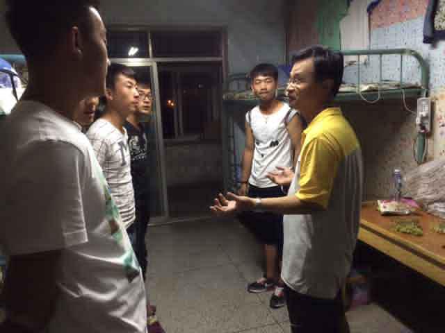 许成林及新生班主任到各个宿舍和同学们亲切交谈,认真询问同学们是否适应新的生活,向同学们介绍了学校吃住环境,与他们拉家常,叮嘱新生注意饮食、用水、用电安全和气候变化,要搞好宿舍之间的关系,鼓励他们发扬不怕苦、不怕累的精神,努力完成好军训工作。