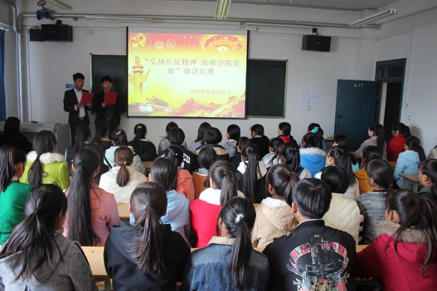 10月25日、26日组织学生观看大型纪录片《长征》,通过了解红军长征胜利的历史故事,体会红军长征精神,抒发对革命先烈的敬仰之情,在感人的故事中回顾革命历史,感恩幸福生活。10月31日晚,在博学楼612举行了以“弘扬长征精神、助推学院发展”为主题的演讲比赛。通过不同形式的活动,号召同学们弘扬长征精神,从小做起,从一点一滴做起,为中华民族的复兴而努力学习,让红军精神在莘莘学子中传承。