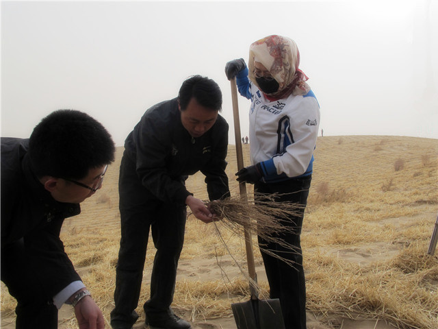 到达治沙造林现场后,师生按照划分好的区域,带上塑料桶,拿上土钻,马上投入到了紧张的劳动中。在现场技术人员的指导下挖坑、栽种树苗、浇水,完成了预定的治沙造林任务。
