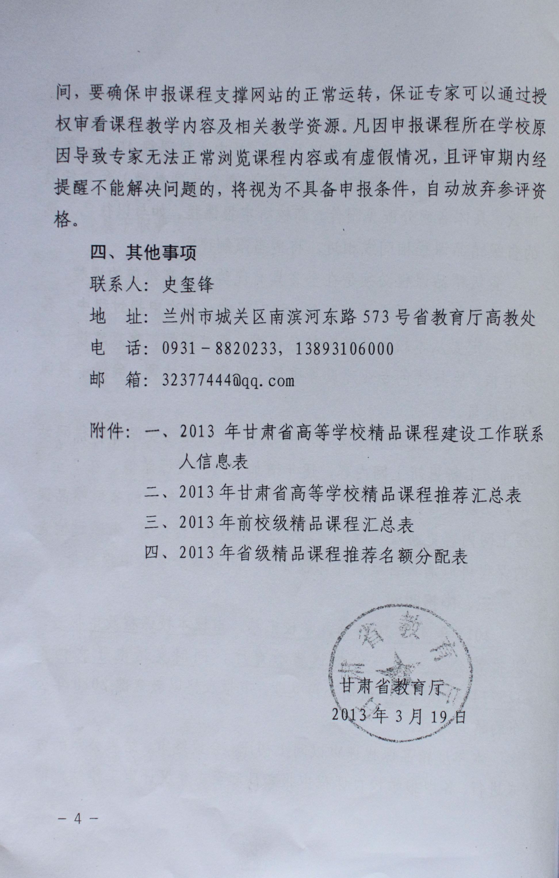 2.经研究确定为推荐申报省级精品课程的,于4月18日前将定稿的2013年省级精品课程申报书电子档传至教务处赵晓丽处,申报表格以教育部2010年公布的格式为准。